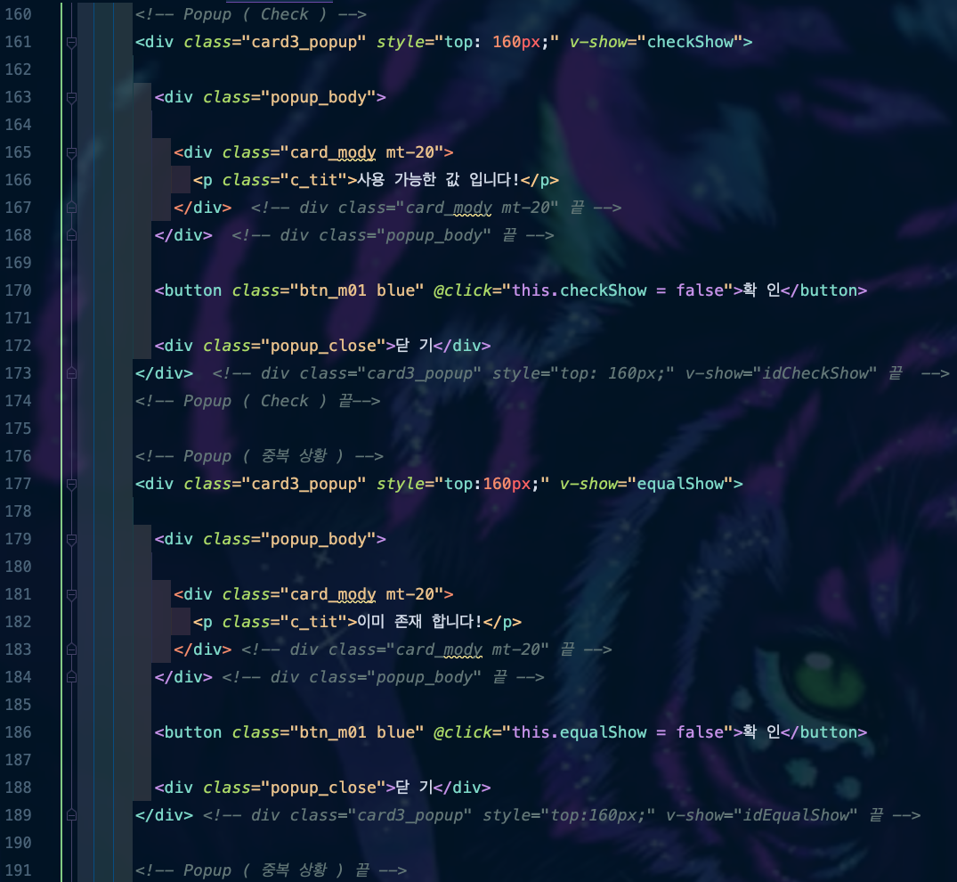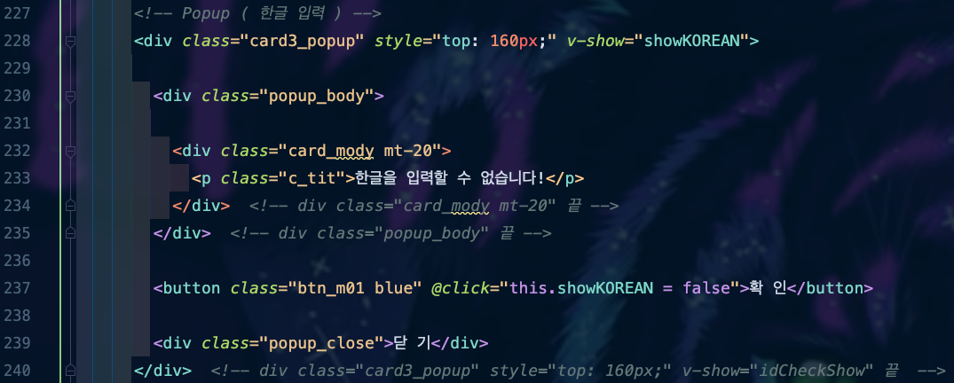 237๋ฒ์งธ ์ค์ 'ํ์ธ' Button์ด ์๋ ๊ฒ์ด์์. ์ฌ๊ธฐ `@click`์ผ๋ก ์ธํด Click Event๊ฐ ๋ฐ์ํ๊ฒ๋๋ฉด `showKOREAN` ๋ณ์๊ฐ `false`๋ก ๋ฐ๋๊ฒ ๋๊ณ , 228๋ฒ์งธ ์ค์ `v-show`๋ `true`์ผ ๋๋ง ๋์ํ๊ธฐ ๋๋ฌธ์ ๋ง์น `Modal` ์ฐฝ์ด ์ฌ๋ผ์ง๋ ๊ฒ์ฒ๋ผ ๋ณด์ด๊ฒ ๋๋ ๊ฒ์ด์์.