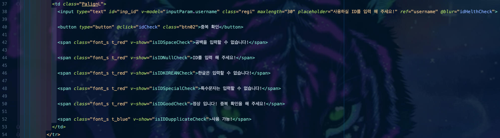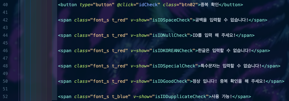๋ฐ๋ก ์ฌ๊ธฐ 44๋ฒ์งธ ์ค์ `v-show`๊ฐ ๋์ํ๋ฉด์ ID ์ ๋ ฅ๋ ์์ ID๋ฅผ ์ ๋ ฅ ํด ์ฃผ์ธ์! ๋ผ๋ ๊ธ๊ท๊ฐ ๋ณด์ด๊ฒ ๋ ๊ฒ์ด์์.