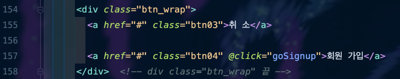 ํ์ ๊ฐ์ Button์ ๋๋ฅด๊ฒ ๋๋ฉด ์์ ๊ทธ๋ฆผ์์ 157๋ฒ์งธ <a> Tag๊ฐ ๋์ํ๊ฒ ๋๋๋ฐ, `@click`์ผ๋ก ์ธํด Click Event๊ฐ ๋ฐ์๋๋ฉด `goSignup()`์ด ํธ์ถ๋๊ฒ ๋๋ ๊ฒ์ด์์.