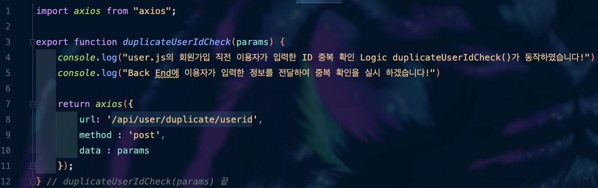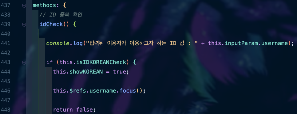 ๊ทธ๋ผ ์ผ๋ฅธ `idCheck()`๋ฅผ ๋ง๋๋ฌ ๊ฐ๋ด์ผ ๊ฒ ์ด์! ๐
