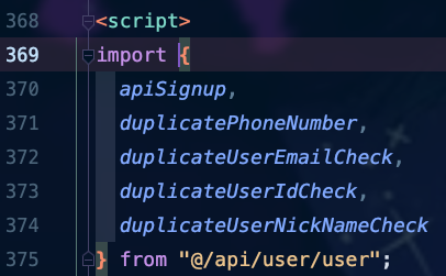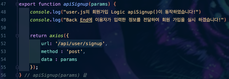 825๋ฒ์งธ ์ค์ ๋ณด๋ฉด `Axios`๋ฅผ ์ด์ฉํ๊ธฐ ์ํ Method `apiSignUp`์ ํธ์ถํ๋ ๊ฒ์ด์์.