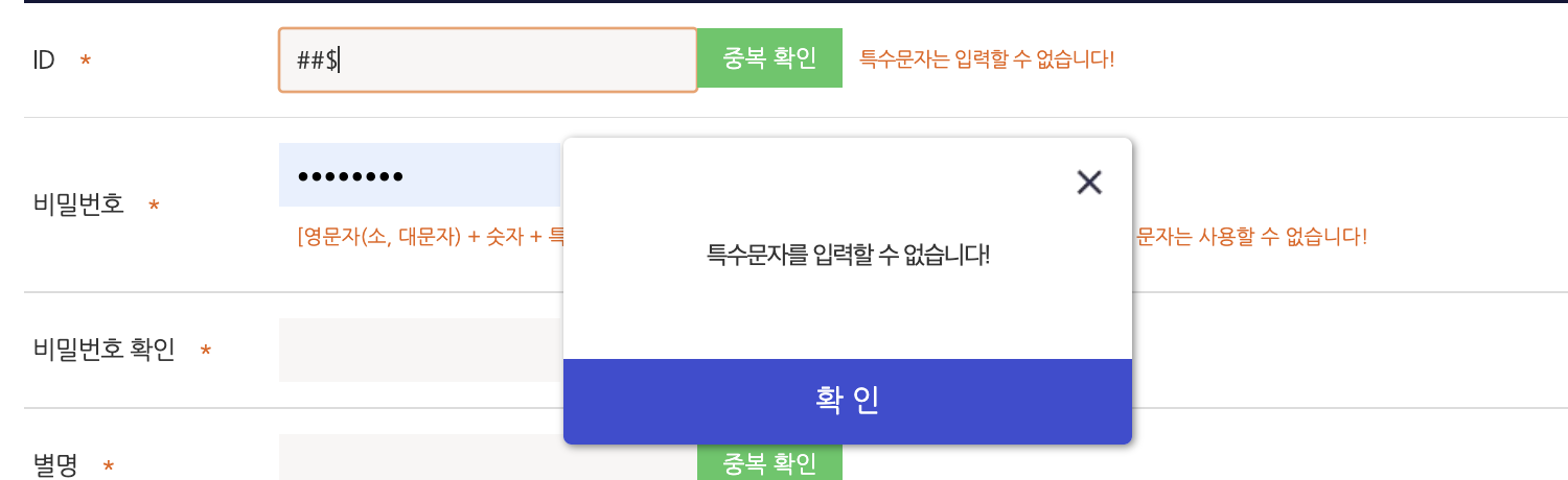 ์ฃผ๋ํ๋์ null ํ์ธ(449 ~ 454), ๊ณต๋ฐฑ ํ์ธ(455 ~ 460), ํน์ ๋ฌธ์ ์ ๋ ฅ ํ์ธ(461 ~ 466)์ ๋์ผํ๊ฒ ๋ง๋ค์ด ํด๋น If๋ฌธ์ ์ง์ ํ๊ฒ ๋๋ฉด ํด๋น ๋ด์ฉ์ ๋์๋๋ `Modal` ์ฐฝ์ด ๋จ๋๋ก ๋ง๋ค์ด ์ค ๊ฒ์ด์์.