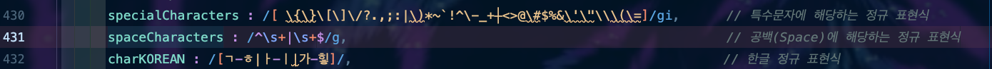 ์ด๋ฒ์๋ `charKOREAN`์ ์ฃผ๋ชฉํด์ผ ํ๋ ๊ฒ์ด์์. ์ด ๊ณณ์๋ ํ๊ธ์ ํด๋นํ๋ ์ ๊ท ํํ์์ด ๋ค์ด ์๋๋ฐ,