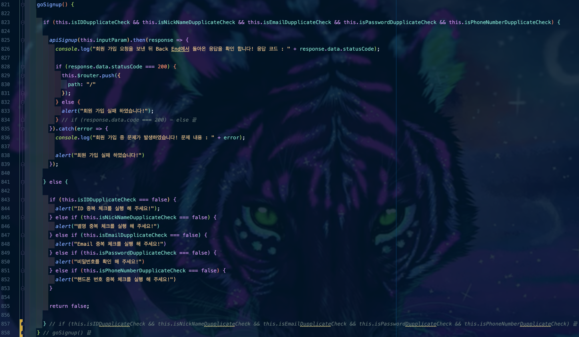 ๋ค์ ์ด ๊ณณ์ผ๋ก ๋์์ `Back End`์๊ฒ ๋ฐ์ `์๋ต(Response)`์ ๋ํ Data๊ฐ 824๋ฒ์งธ ์ค `response`์ ๋ด๊ธฐ๊ฒ ๋๊ณ , 825๋ฒ์งธ ์ค์ `์๋ต(Response)` Data ์ค `statusCode(HTTP Status Code Number)`๊ฐ์ด ๋ฌด์์ธ์ง Console์ ์ฐ์ด ์ค ๋ค 827๋ฒ์งธ ์ค์ ํด๋น ๊ฐ์ด 200๊ณผ ๊ฐ๋ค๋ฉด if๋ฌธ์ด ๋์ํ๊ฒ ํด ์ค ๊ฒ์ด์์.