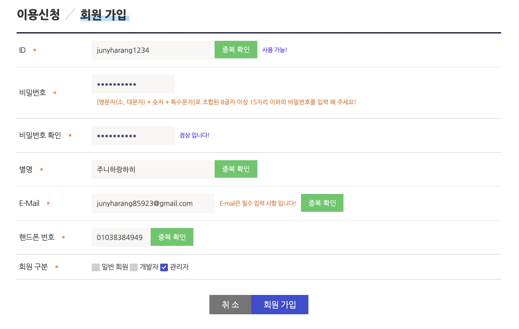 ์ด ์ธ์ ์ฃผ๋ํ๋์ ์๋ ํ์ ๊ฐ์ ์ฐฝ๊ณผ ๊ฐ์ด ๋น๋ฐ๋ฒํธ, ๋ณ๋ช (Nick Name), E-mail ์ฃผ์, ํธ๋ํฐ ๋ฒํธ์ ๋ํด ์ ํจ์ฑ ๊ฒ์ฌ๋ฅผ ํ๊ณ , ์ค๋ณต ๊ฐ์ด ์๋์ง ํ์ธํ๋๋ก ๊ตฌํํ ๊ฒ์ด์์. ์์ธํ ๋ด์ฉ์ ID์ ๋ํ ์์ ๋ด์ฉ๊ณผ ํฌ๊ฒ ๋ค๋ฅผ ๊ฒ์ด ์๊ธฐ ๋๋ฌธ์ ๋ถ์์ ํ์ง ์๊ณ , ๊ถ๊ธํ์ ๋ถ๋ค์ ์ฃผ๋ํ๋์ Git Hub์์ ํด๋น Code๋ฅผ ํ์ธํ์ค ์ ์์ต๋๋ค!