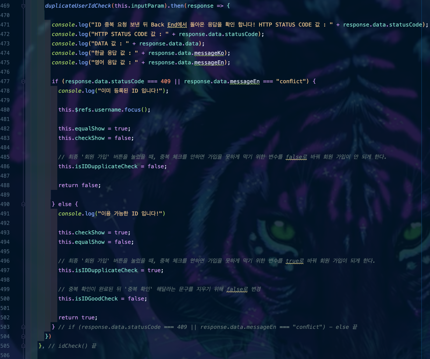 477๋ฒ์งธ ์ค์ Back End์์ `์๋ต(Response)` ๋ฐ์ ๊ฐ ์ค `statusCode(HTTP Status Code) `์ ๋ณ์์ ๊ฐ์ด `409` ๋ผ๋ฉด ํน์ `messageEn(Status Message English)` ๋ณ์์ ๊ฐ์ด `conflict`๋ผ๋ฉด if๋ฌธ์ด ๋์ํ๋๋ก ํ ๊ฒ์ด์์.