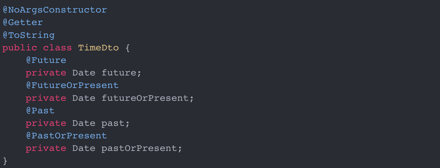 `Jakarata Bean Validation API Packages`μ μλ `javax.validation.constraints` Packageμ μλ κΈ°λ³Έμ μΈ κ²μ¦ Annotaionμ μ΄μ©ν κ²μ΄μμ.