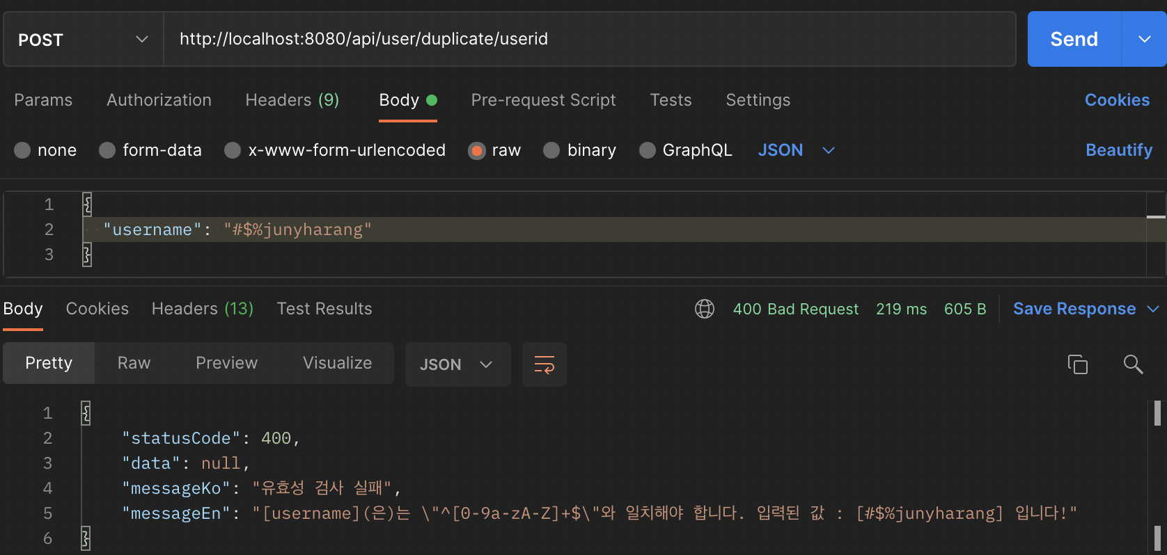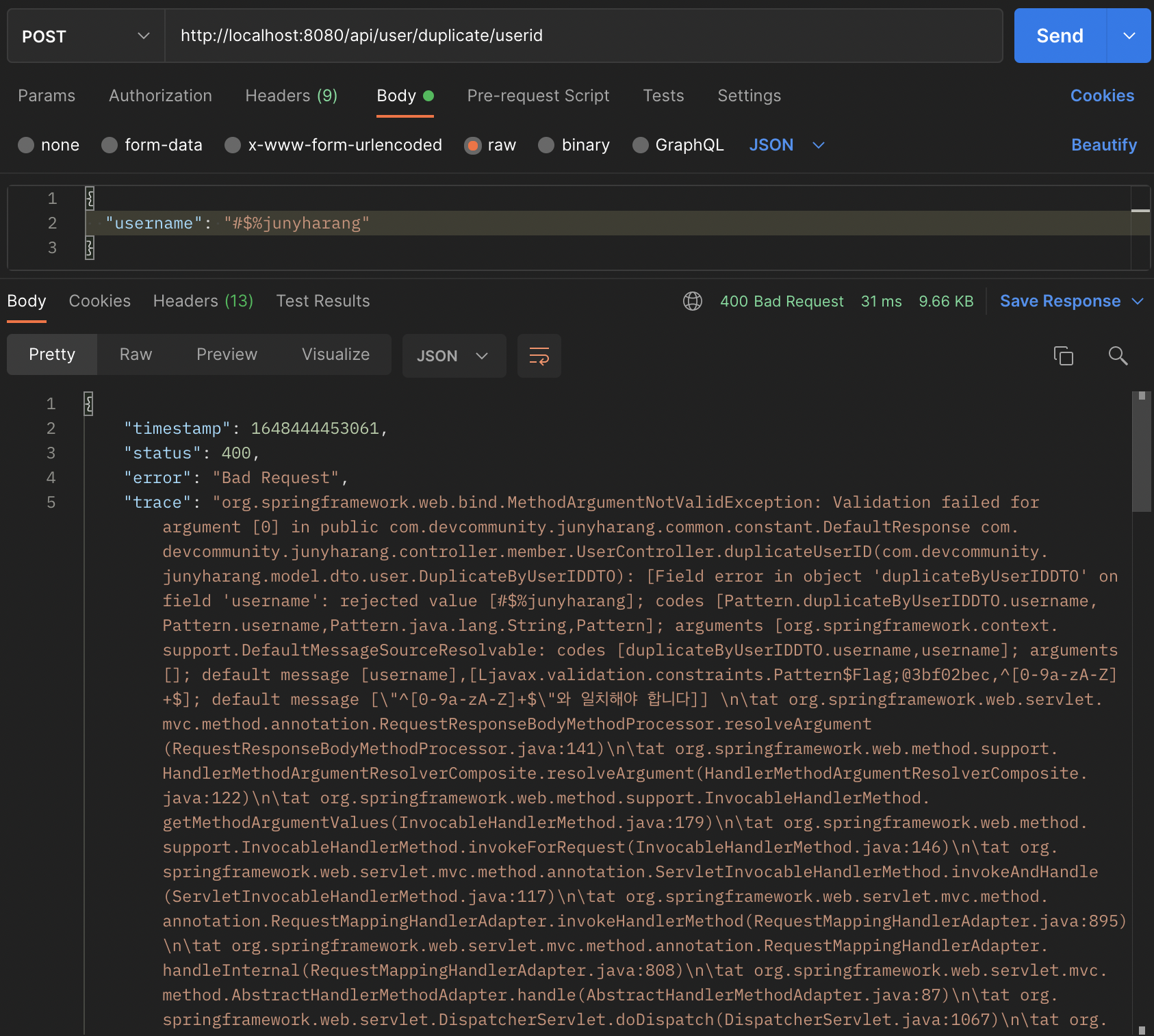 "trace": "org.springframework.web.bind.MethodArgumentNotValidException: Validation failed for argument [0] in public com.devcommunity.junyharang.common.constant.DefaultResponse com.devcommunity.junyharang.controller.member.UserController.duplicateUserID(com.devcommunity.junyharang.model.dto.user.DuplicateByUserIDDTO): [Field error in object 'duplicateByUserIDDTO' on field 'username': rejected value [#$%junyharang]; codes [Pattern.duplicateByUserIDDTO.username,Pattern.username,Pattern.java.lang.String,Pattern]; arguments [org.springframework.context.support.DefaultMessageSourceResolvable: codes [duplicateByUserIDDTO.username,username]; arguments []; default message [username],[Ljavax.validation.constraints.Pattern$Flag;@3bf02bec,^[0-9a-zA-Z]+$]; default message [\"^[0-9a-zA-Z]+$\"์ ์ผ์นํด์ผ ํฉ๋๋ค]] \n\tat org.springframework.web.servlet.mvc.method.annotation.RequestResponseBodyMethodProcessor.resolveArgument(RequestResponseBodyMethodProcessor.java:141)\n\tat org.springframework.web.method.support.HandlerMethodArgumentResolverComposite.resolveArgument(HandlerMethodArgumentResolverComposite.java:122)\n\tat org.springframework.web.method.support.InvocableHandlerMethod.getMethodArgumentValues(InvocableHandlerMethod.java:179)\n\tat org.springframework.web.method.support.InvocableHandlerMethod.invokeForRequest(InvocableHandlerMethod.java:146)\n\tat org.springframework.web.servlet.mvc.method.annotation.ServletInvocableHandlerMethod.invokeAndHandle(ServletInvocableHandlerMethod.java:117)\n\tat org.springframework.web.servlet.mvc.method.annotation.RequestMappingHandlerAdapter.invokeHandlerMethod(RequestMappingHandlerAdapter.java:895)\n\tat org.springframework.web.servlet.mvc.method.annotation.RequestMappingHandlerAdapter.handleInternal(RequestMappingHandlerAdapter.java:808)\n\tat org.springframework.web.servlet.mvc.method.AbstractHandlerMethodAdapter.handle(AbstractHandlerMethodAdapter.java:87)\n\tat org.springframework.web.servlet.DispatcherServlet.doDispatch(DispatcherServlet.java:1067)\n\tat org.springframework.web.servlet.DispatcherServlet.doService(DispatcherServlet.java:963)\n\tat org.springframework.web.servlet.FrameworkServlet.processRequest(FrameworkServlet.java:1006)\n\tat org.springframework.web.servlet.FrameworkServlet.doPost(FrameworkServlet.java:909)\n\tat javax.servlet.http.HttpServlet.service(HttpServlet.java:681)\n\tat org.springframework.web.servlet.FrameworkServlet.service(FrameworkServlet.java:883)\n\tat javax.servlet.http.HttpServlet.service(HttpServlet.java:764)\n\tat org.apache.catalina.core.ApplicationFilterChain.internalDoFilter(ApplicationFilterChain.java:227)\n\tat org.apache.catalina.core.ApplicationFilterChain.doFilter(ApplicationFilterChain.java:162)\n\tat org.apache.tomcat.websocket.server.WsFilter.doFilter(WsFilter.java:53)\n\tat org.apache.catalina.core.ApplicationFilterChain.internalDoFilter(ApplicationFilterChain.java:189)\n\tat org.apache.catalina.core.ApplicationFilterChain.doFilter(ApplicationFilterChain.java:162)\n\tat org.springframework.security.web.FilterChainProxy$VirtualFilterChain.doFilter(FilterChainProxy.java:327)\n\tat org.springframework.security.web.access.intercept.FilterSecurityInterceptor.invoke(FilterSecurityInterceptor.java:115)\n\tat org.springframework.security.web.access.intercept.FilterSecurityInterceptor.doFilter(FilterSecurityInterceptor.java:81)\n\tat org.springframework.security.web.FilterChainProxy$VirtualFilterChain.doFilter(FilterChainProxy.java:336)\n\tat org.springframework.security.web.access.ExceptionTranslationFilter.doFilter(ExceptionTranslationFilter.java:122)\n\tat org.springframework.security.web.access.ExceptionTranslationFilter.doFilter(ExceptionTranslationFilter.java:116)\n\tat org.springframework.security.web.FilterChainProxy$VirtualFilterChain.doFilter(FilterChainProxy.java:336)\n\tat org.springframework.security.web.session.SessionManagementFilter.doFilter(SessionManagementFilter.java:126)\n\tat org.springframework.security.web.session.SessionManagementFilter.doFilter(SessionManagementFilter.java:81)\n\tat org.springframework.security.web.FilterChainProxy$VirtualFilterChain.doFilter(FilterChainProxy.java:336)\n\tat org.springframework.security.web.authentication.AnonymousAuthenticationFilter.doFilter(AnonymousAuthenticationFilter.java:109)\n\tat org.springframework.security.web.FilterChainProxy$VirtualFilterChain.doFilter(FilterChainProxy.java:336)\n\tat org.springframework.security.web.servletapi.SecurityContextHolderAwareRequestFilter.doFilter(SecurityContextHolderAwareRequestFilter.java:149)\n\tat org.springframework.security.web.FilterChainProxy$VirtualFilterChain.doFilter(FilterChainProxy.java:336)\n\tat org.springframework.security.web.savedrequest.RequestCacheAwareFilter.doFilter(RequestCacheAwareFilter.java:63)\n\tat org.springframework.security.web.FilterChainProxy$VirtualFilterChain.doFilter(FilterChainProxy.java:336)\n\tat org.springframework.security.web.authentication.logout.LogoutFilter.doFilter(LogoutFilter.java:103)\n\tat org.springframework.security.web.authentication.logout.LogoutFilter.doFilter(LogoutFilter.java:89)\n\tat org.springframework.security.web.FilterChainProxy$VirtualFilterChain.doFilter(FilterChainProxy.java:336)\n\tat org.springframework.security.web.header.HeaderWriterFilter.doHeadersAfter(HeaderWriterFilter.java:90)\n\tat org.springframework.security.web.header.HeaderWriterFilter.doFilterInternal(HeaderWriterFilter.java:75)\n\tat org.springframework.web.filter.OncePerRequestFilter.doFilter(OncePerRequestFilter.java:117)\n\tat org.springframework.security.web.FilterChainProxy$VirtualFilterChain.doFilter(FilterChainProxy.java:336)\n\tat org.springframework.security.web.context.SecurityContextPersistenceFilter.doFilter(SecurityContextPersistenceFilter.java:110)\n\tat org.springframework.security.web.context.SecurityContextPersistenceFilter.doFilter(SecurityContextPersistenceFilter.java:80)\n\tat org.springframework.security.web.FilterChainProxy$VirtualFilterCh