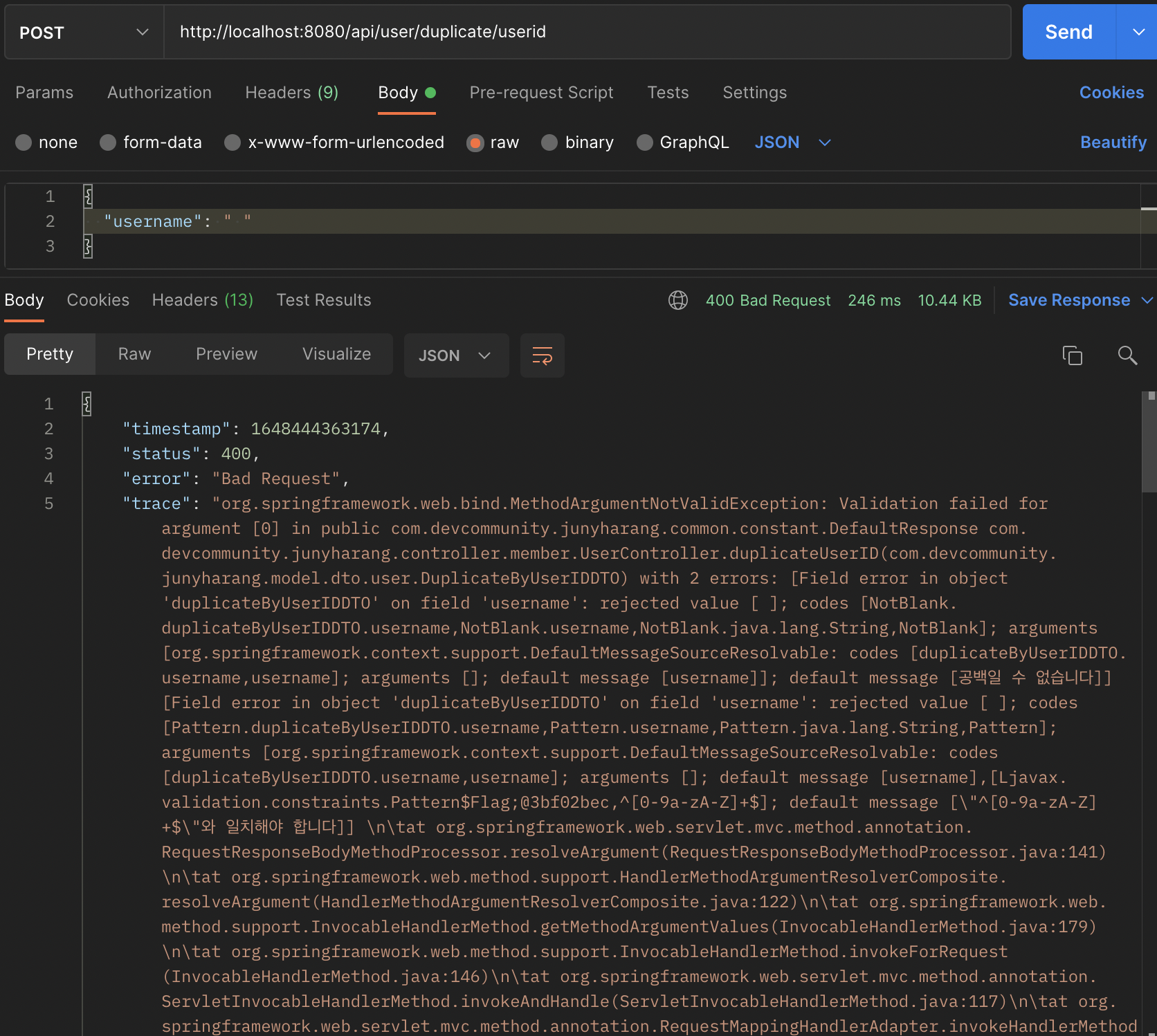 "trace": "org.springframework.web.bind.MethodArgumentNotValidException: Validation failed for argument [0] in public com.devcommunity.junyharang.common.constant.DefaultResponse com.devcommunity.junyharang.controller.member.UserController.duplicateUserID(com.devcommunity.junyharang.model.dto.user.DuplicateByUserIDDTO) with 2 errors: [Field error in object 'duplicateByUserIDDTO' on field 'username': rejected value [ ]; codes [NotBlank.duplicateByUserIDDTO.username,NotBlank.username,NotBlank.java.lang.String,NotBlank]; arguments [org.springframework.context.support.DefaultMessageSourceResolvable: codes [duplicateByUserIDDTO.username,username]; arguments []; default message [username]]; default message [๊ณต๋ฐฑ์ผ ์ ์์ต๋๋ค]] [Field error in object 'duplicateByUserIDDTO' on field 'username': rejected value [ ]; codes [Pattern.duplicateByUserIDDTO.username,Pattern.username,Pattern.java.lang.String,Pattern]; arguments [org.springframework.context.support.DefaultMessageSourceResolvable: codes [duplicateByUserIDDTO.username,username]; arguments []; default message [username],[Ljavax.validation.constraints.Pattern$Flag;@3bf02bec,^[0-9a-zA-Z]+$]; default message [\"^[0-9a-zA-Z]+$\"์ ์ผ์นํด์ผ ํฉ๋๋ค]] \n\tat org.springframework.web.servlet.mvc.method.annotation.RequestResponseBodyMethodProcessor.resolveArgument(RequestResponseBodyMethodProcessor.java:141)\n\tat org.springframework.web.method.support.HandlerMethodArgumentResolverComposite.resolveArgument(HandlerMethodArgumentResolverComposite.java:122)\n\tat org.springframework.web.method.support.InvocableHandlerMethod.getMethodArgumentValues(InvocableHandlerMethod.java:179)\n\tat org.springframework.web.method.support.InvocableHandlerMethod.invokeForRequest(InvocableHandlerMethod.java:146)\n\tat org.springframework.web.servlet.mvc.method.annotation.ServletInvocableHandlerMethod.invokeAndHandle(ServletInvocableHandlerMethod.java:117)\n\tat org.springframework.web.servlet.mvc.method.annotation.RequestMappingHandlerAdapter.invokeHandlerMethod(RequestMappingHandlerAdapter.java:895)\n\tat org.springframework.web.servlet.mvc.method.annotation.RequestMappingHandlerAdapter.handleInternal(RequestMappingHandlerAdapter.java:808)\n\tat org.springframework.web.servlet.mvc.method.AbstractHandlerMethodAdapter.handle(AbstractHandlerMethodAdapter.java:87)\n\tat org.springframework.web.servlet.DispatcherServlet.doDispatch(DispatcherServlet.java:1067)\n\tat org.springframework.web.servlet.DispatcherServlet.doService(DispatcherServlet.java:963)\n\tat org.springframework.web.servlet.FrameworkServlet.processRequest(FrameworkServlet.java:1006)\n\tat org.springframework.web.servlet.FrameworkServlet.doPost(FrameworkServlet.java:909)\n\tat javax.servlet.http.HttpServlet.service(HttpServlet.java:681)\n\tat org.springframework.web.servlet.FrameworkServlet.service(FrameworkServlet.java:883)\n\tat javax.servlet.http.HttpServlet.service(HttpServlet.java:764)\n\tat org.apache.catalina.core.ApplicationFilterChain.internalDoFilter(ApplicationFilterChain.java:227)\n\tat org.apache.catalina.core.ApplicationFilterChain.doFilter(ApplicationFilterChain.java:162)\n\tat org.apache.tomcat.websocket.server.WsFilter.doFilter(WsFilter.java:53)\n\tat org.apache.catalina.core.ApplicationFilterChain.internalDoFilter(ApplicationFilterChain.java:189)\n\tat org.apache.catalina.core.ApplicationFilterChain.doFilter(ApplicationFilterChain.java:162)\n\tat org.springframework.security.web.FilterChainProxy$VirtualFilterChain.doFilter(FilterChainProxy.java:327)\n\tat org.springframework.security.web.access.intercept.FilterSecurityInterceptor.invoke(FilterSecurityInterceptor.java:115)\n\tat org.springframework.security.web.access.intercept.FilterSecurityInterceptor.doFilter(FilterSecurityInterceptor.java:81)\n\tat org.springframework.security.web.FilterChainProxy$VirtualFilterChain.doFilter(FilterChainProxy.java:336)\n\tat org.springframework.security.web.access.ExceptionTranslationFilter.doFilter(ExceptionTranslationFilter.java:122)\n\tat org.springframework.security.web.access.ExceptionTranslationFilter.doFilter(ExceptionTranslationFilter.java:116)\n\tat org.springframework.security.web.FilterChainProxy$VirtualFilterChain.doFilter(FilterChainProxy.java:336)\n\tat org.springframework.security.web.session.SessionManagementFilter.doFilter(SessionManagementFilter.java:126)\n\tat org.springframework.security.web.session.SessionManagementFilter.doFilter(SessionManagementFilter.java:81)\n\tat org.springframework.security.web.FilterChainProxy$VirtualFilterChain.doFilter(FilterChainProxy.java:336)\n\tat org.springframework.security.web.authentication.AnonymousAuthenticationFilter.doFilter(AnonymousAuthenticationFilter.java:109)\n\tat org.springframework.security.web.FilterChainProxy$VirtualFilterChain.doFilter(FilterChainProxy.java:336)\n\tat org.springframework.security.web.servletapi.SecurityContextHolderAwareRequestFilter.doFilter(SecurityContextHolderAwareRequestFilter.java:149)\n\tat org.springframework.security.web.FilterChainProxy$VirtualFilterChain.doFilter(FilterChainProxy.java:336)\n\tat org.springframework.security.web.savedrequest.RequestCacheAwareFilter.doFilter(RequestCacheAwareFilter.java:63)\n\tat org.springframework.security.web.FilterChainProxy$VirtualFilterChain.doFilter(FilterChainProxy.java:336)\n\tat org.springframework.security.web.authentication.logout.LogoutFilter.doFilter(LogoutFilter.java:103)\n\tat org.springframework.security.web.authentication.logout.LogoutFilter.doFilter(LogoutFilter.java:89)\n\tat org.springframework.security.web.FilterChainProxy$VirtualFilterChain.doFilter(FilterChainProxy.java:336)\n\tat org.springframework.security.web.header.HeaderWriterFilter.doHeadersAfter(HeaderWriterFilter.java:90)\n\tat org.springframework.security.web.header.HeaderWriterFilter.doFilterInternal(HeaderWriterFilter.java:75)\n\tat org.springframework.web.filter.OncePerRequestFilter.doFilter(OncePerRequestFilter.java:117)\n\tat org.springfr