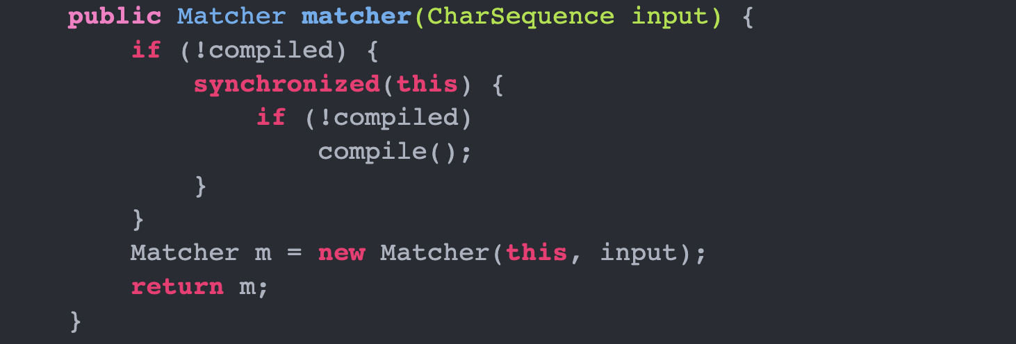 โ `Pattern` ์์ฑ ์ `Pattern` ๊ฐ์ฒด๋ฅผ ๋ฐํํ๋ ์ ์ `compile` Method ํธ์ถ.