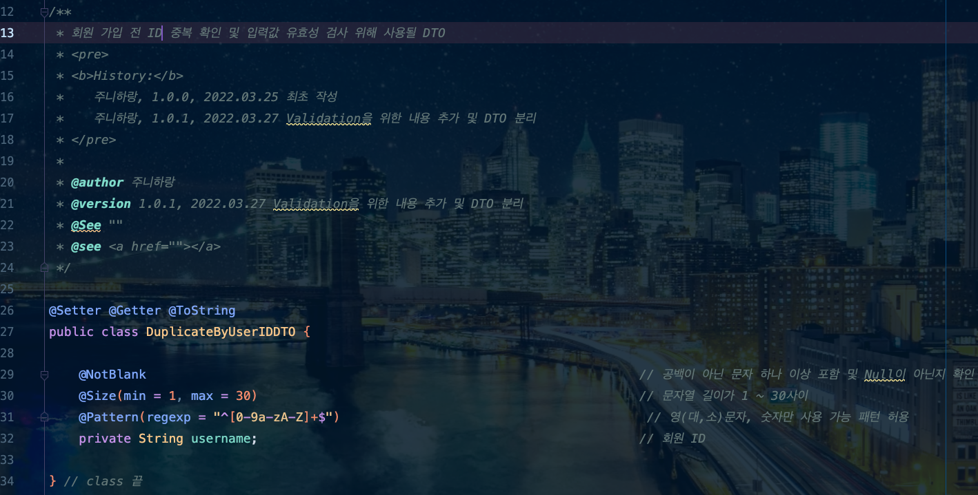 ์ฃผ๋ํ๋์ ์ ๊ทธ๋ฆผ๊ณผ ๊ฐ์ด DTO ๊ฐ์ฒด๋ฅผ ์ ์ํ๊ณ , username(ID) ํ๋์ ์ด๋ป๊ฒ ๊ฐ์ ๋ฐ์์ง์ ๋ํด ์ ์ํด ์ค ๊ฒ์ด์์.