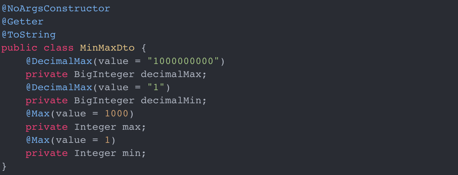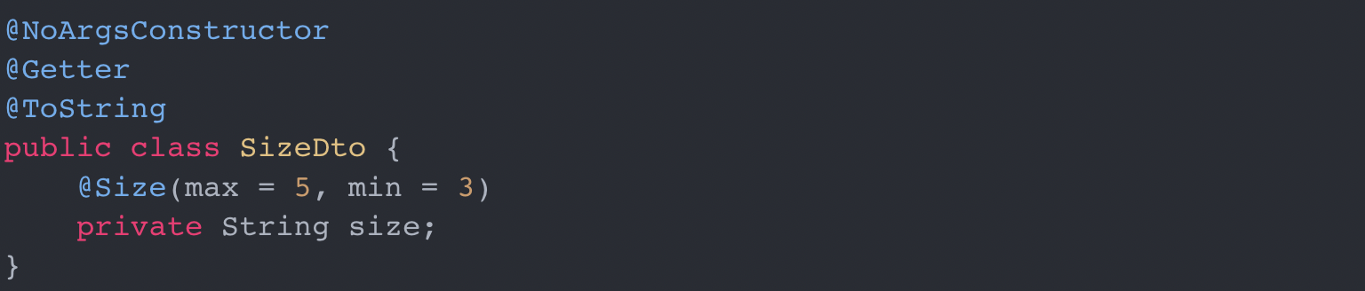 β @Size(min = x, max = x) : min λ³΄λ€ ν¬κ±°λ, κ°κ³ , max λ³΄λ€ μκ±°λ, κ°μ λ¬Έμμ΄ κΈΈμ΄ λ΄μ κ°λ§ μμ©νλ€.