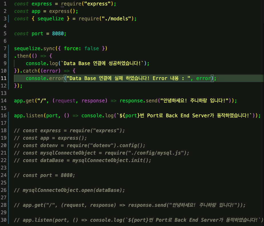 ๊ทธ๋ฐ ๋ค์ ์์ ๊ฐ์ด `app.js`์ `sequelize`๋ฅผ ์ด์ฉํ๊ธฐ ์ํด ์์ ์ ํด์ฃผ๊ณ , ์คํ์ ํด ๋ณด๋ฉด