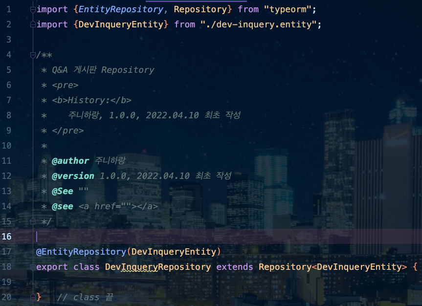 21๋ฒ์งธ ์ค์ `Repository`๋ฅผ `import` ํด์ค ๊ฒ์ด์์.