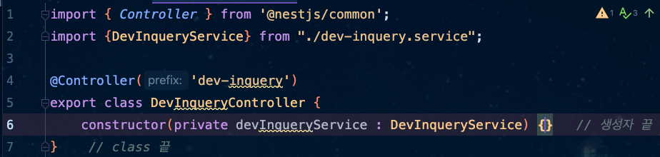 11๋ฒ์งธ ์ค์ `devInqueryService` Parameter๋ฅผ `DevInqueryController`์์ ์ด์ฉํ ์ ์๊ฒ `this.devInqueryService Property`์ `devInqueryService` Parameter๋ฅผ ํ ๋นํด ์ฃผ๋ ๊ฒ์ด์์.