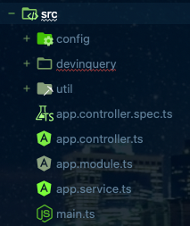 src ๋ฐ์ ์๋์ผ๋ก ์์ฑ๋ `app.controller.spec.ts`, `app.controller.ts`, `app.service.ts`๋ ์ ๊ฑฐํด ์ฃผ๋๋ก ํ ๊ฒ์ด์์.