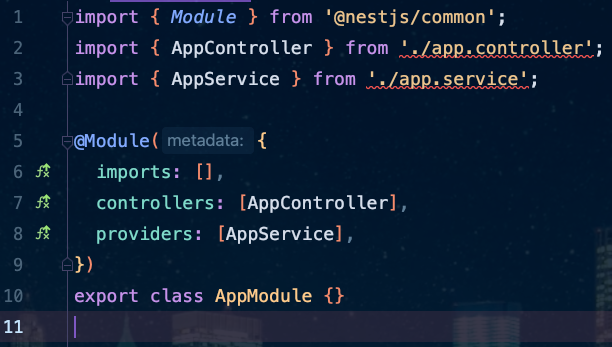 ๋ํ, Module์ ํ์ธํด ๋ณด๋ฉด ์๋์ผ๋ก `Controller`์ `providers`๋ผ๊ณ ๋ช ๋ช ๋ `Service`๊ฐ ๋ฑ๋ก๋์ด ์๋ ๊ฒ์ด์์.