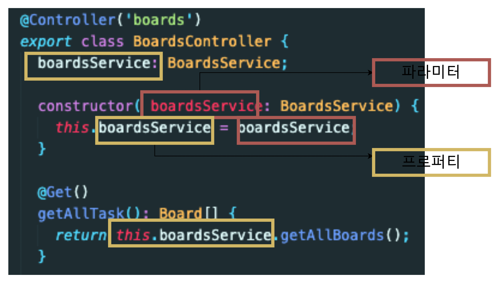 `Spring Boot`์์๋ `Contorller`์์ `Service`๋ฅผ DIํ๊ธฐ ์ํด Member ๋ณ์๋ก `Service` ๊ฐ์ฒด ์๋ฃํ ํ์ ๋ณ์๋ฅผ ์ ์ธํ๊ณ , ์ด๋ฅผ ์์ฑ์๋ฅผ ํตํด `this.{service-name} = {service-name}`์ ํ์ฌ DI๋ฅผ ํ๊ฑฐ๋, `final`๋ก ์ ์ธํ์ฌ `@RequireArgsConstructor`๋ฅผ ์ด์ฉํ๋ ๋ฑ์ ๋ฐฉ์์ ์ผ์๋๋ฐ, `Nest.js`๋ ์ด๋ ๊ฒ `constructor`๋ผ๋ Keyword๋ฅผ ํตํด ์์ฑ์๋ฅผ ๋ง๋ค๊ณ , `private`์ด๋ผ๋ ์ ๊ทผ ์ ํ์๋ฅผ ์ ์ธํด์ `Service` ๊ฐ์ฒด๋ฅผ ์ ์ธํด์ฃผ๋ฉด ๋๋ ๊ฒ์ด์์.
