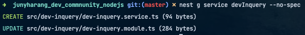 ์์ ๋ช ๋ น์ด์์ `--no-spec`์ ์ ํ์ฌํญ์ธ๋ฐ, ์์ ๊ฐ์ด ์ ๋ ฅํ๋ฉด `Test Code`๋ฅผ ์๋์ผ๋ก ๋ง๋ค์ง ์๋ ๊ฒ์ด์์.