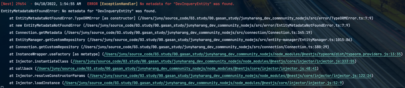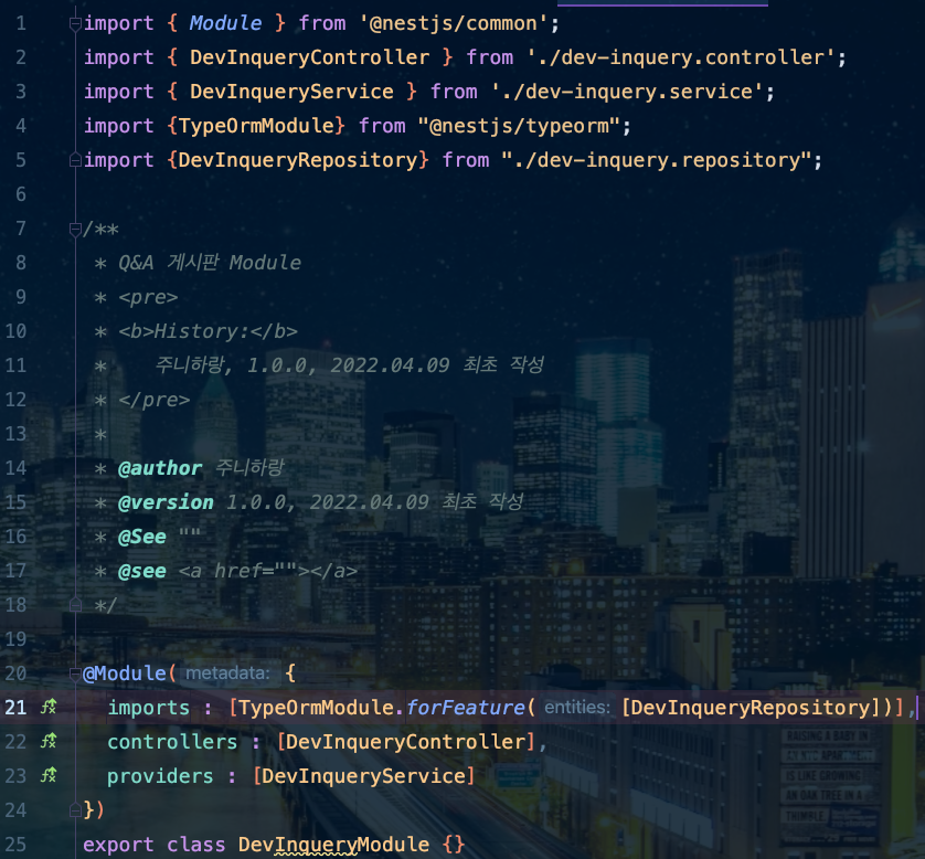 ์ `Repository`๋ฅผ ๋ค๋ฅธ ๊ณณ์์๋ ์ด์ฉ ๊ฐ๋ฅํ๊ฒ ํ๊ธฐ ์ํด (Injectable) `dev-inquery.module.ts`์์ `import`ํด์ค์ผ ํ๋ ๊ฒ์ด์์.