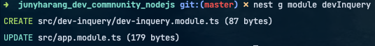 ์์ ๋ง๋ Module์ ์ฌ์ฉํ๊ธฐ ์ํด์๋ `Root` Module์ธ `app.module.ts`์ ๋ฑ๋กํด์ฃผ์ด์ผ ํ๋ ๊ฒ์ด์์. ์ด ๋ถ๋ถ์ ๋ช ๋ น์ด๋ฅผ ํตํด Module์ ๋ง๋ค ๋ ์๋์ผ๋ก ์ ์ธ๋ฉ๋๋ค.
