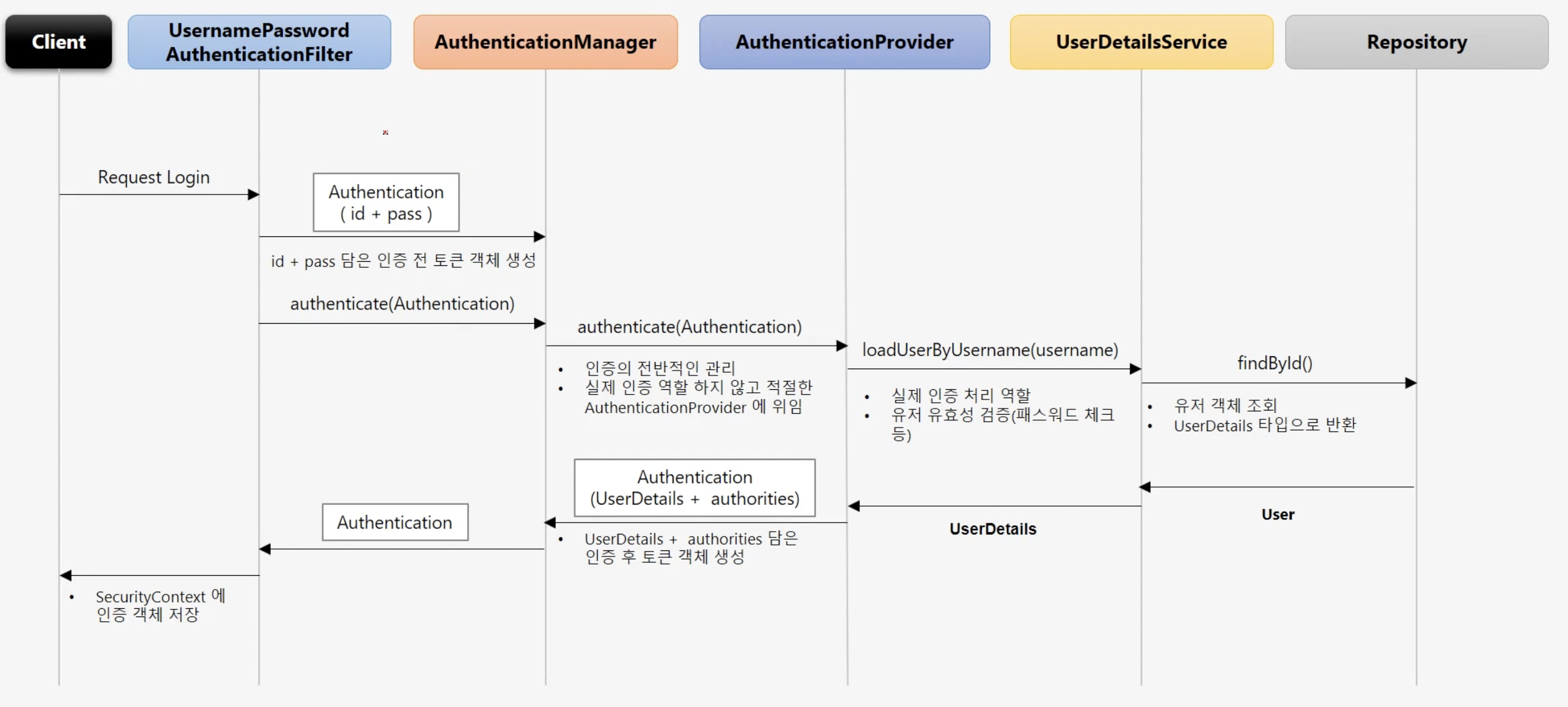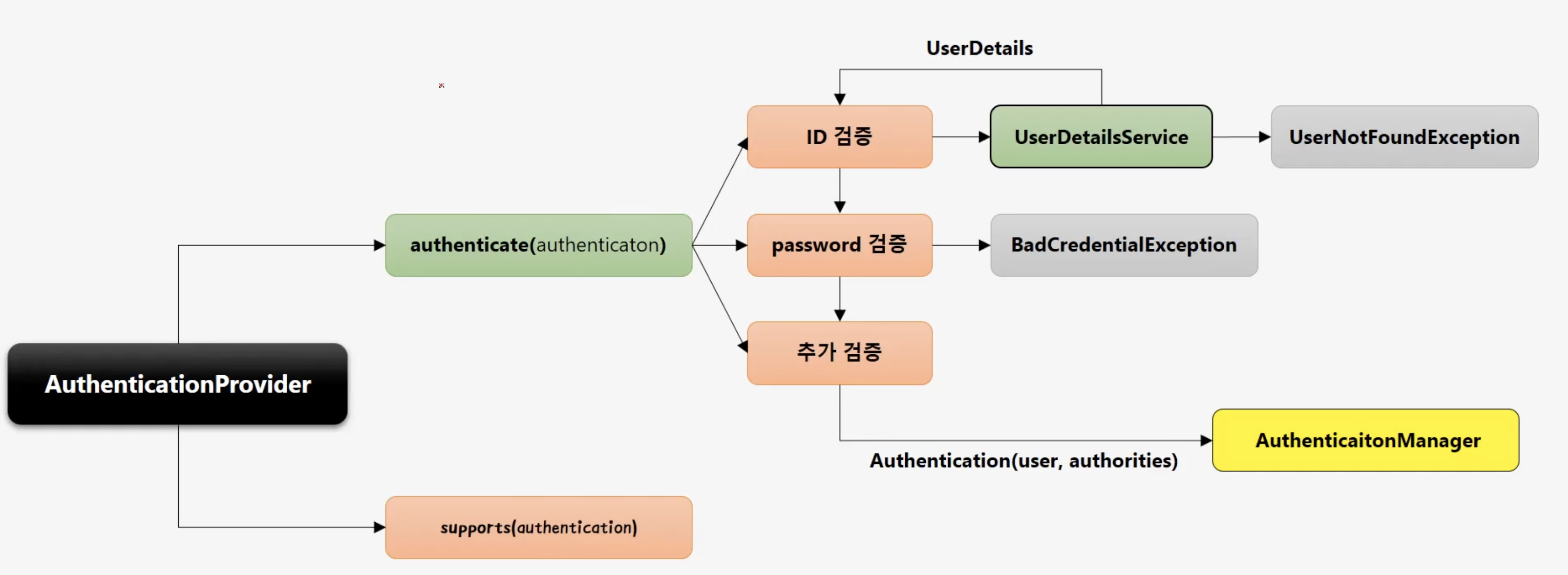 AuthenticationProvider๋ UserDetailsService์ ๊ฐ์ Class๋ฅผ ์ด์ฉํ์ฌ ID, Password๋ฅผ ๊ฒ์ฆํฉ๋๋ค.