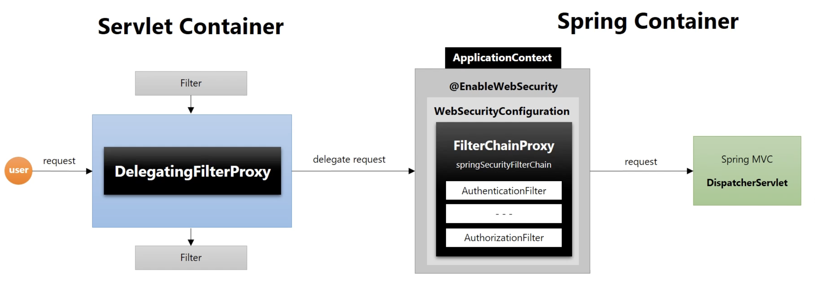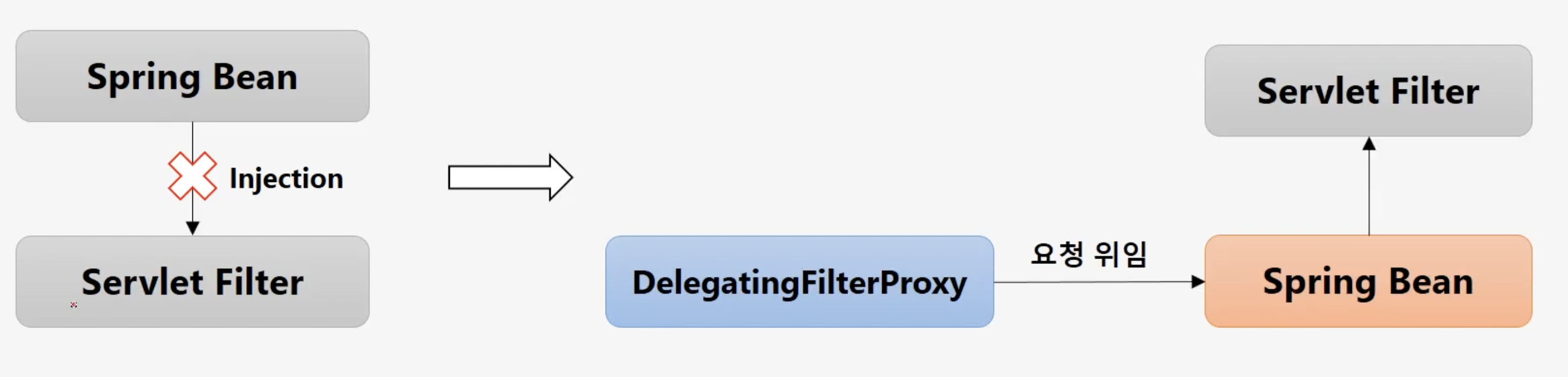 Spring Bean์์ ํด๋น ์์ฒญ์ ๋ฐ๊ฒ ํ๊ธฐ ์ํด์ DelegatingFilterProxy๋ฅผ ์ด์ฉํ ์ ์๋๋ฐ, ์ด Class๋ Servlet Filter์ธ๋ฐ, ์ด์ฉ์ ์์ฒญ์ด Servlet Filter๋ก ๋ค์ด์ค๊ฒ ๋๋ฉด DelegatingFilterProxy๋ ์ด ์์ฒญ์ Spring Bean์์ ๊ด๋ฆฌํ๋ Filter Bean์๊ฒ ์์ํ๋ ์ญํ ์ ํ๊ฒ ๋ฉ๋๋ค.
