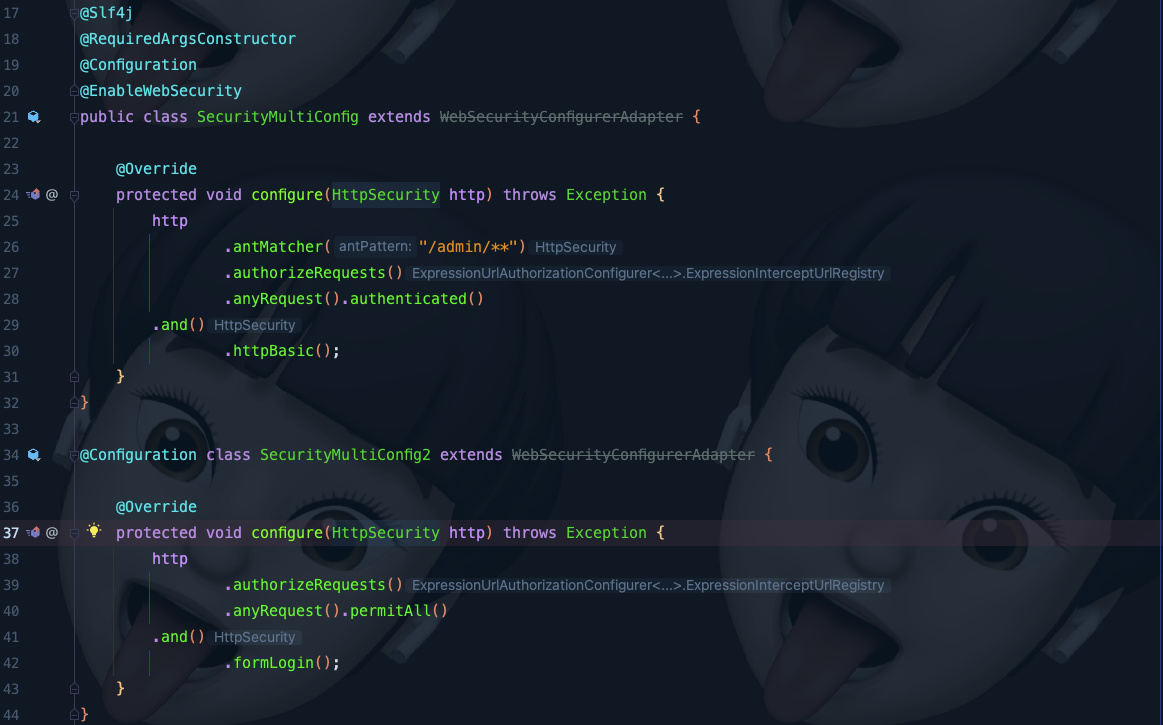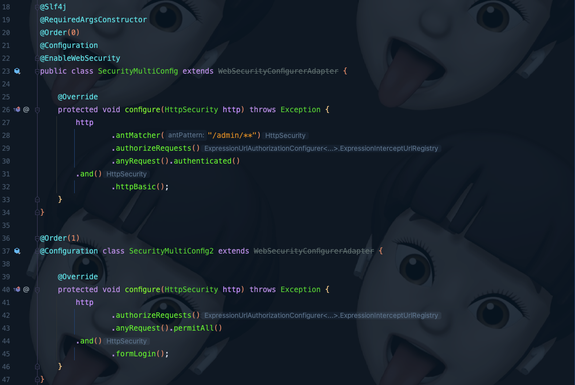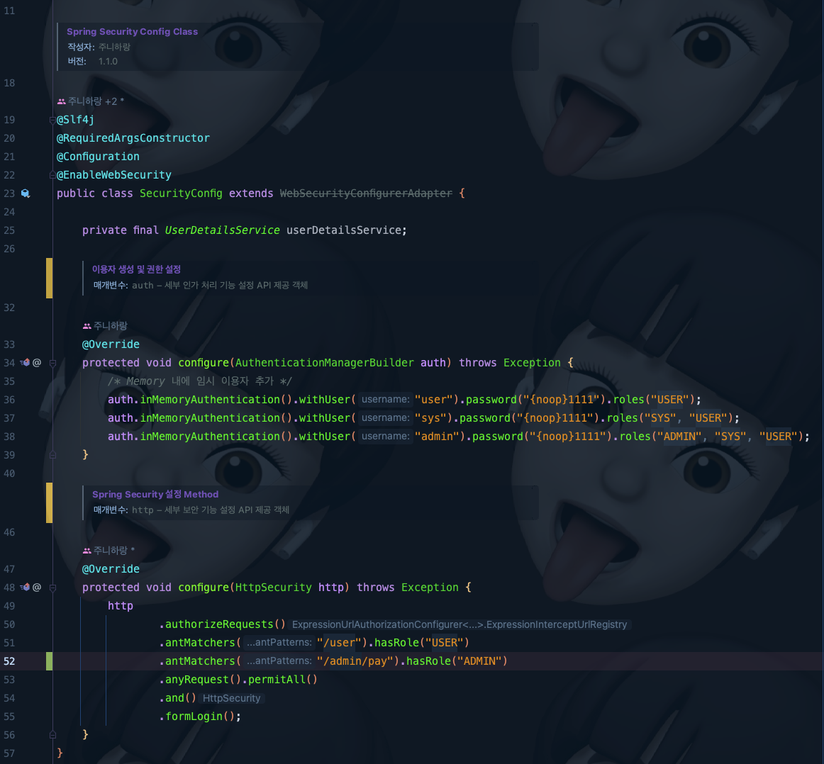 ์์ ๊ทธ๋ฆผ์ฒ๋ผ ๋๊ฐ์ SecurityConfig๋ฅผ ๋ง๋ค๊ฒ ๋๋ฉด ๊ฐ๋ฐ์๊ฐ ์์ฑํ๋๋ก API ์ค์ ๋ค์ด ๋ง๋ค์ด์ง๊ฒ ๋ฉ๋๋ค.