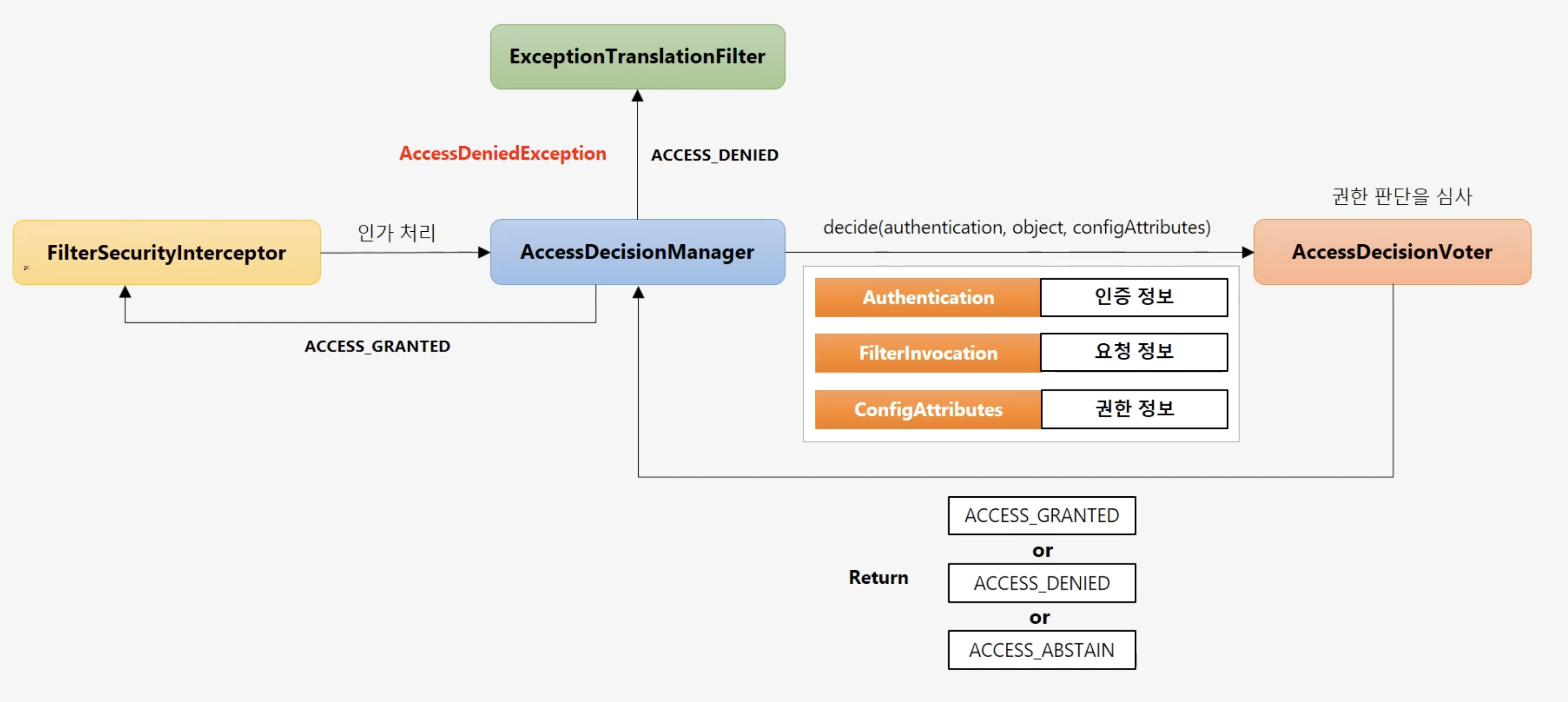 ๊ทธ ๋ค์์ ์ธ๊ฐ ์ฒ๋ฆฌ๋ฅผ ํ๋๋ฐ, ์ด๋ฅผ AccessDecisionManager์๊ฒ ์์ํ๊ฒ ๋ฉ๋๋ค.