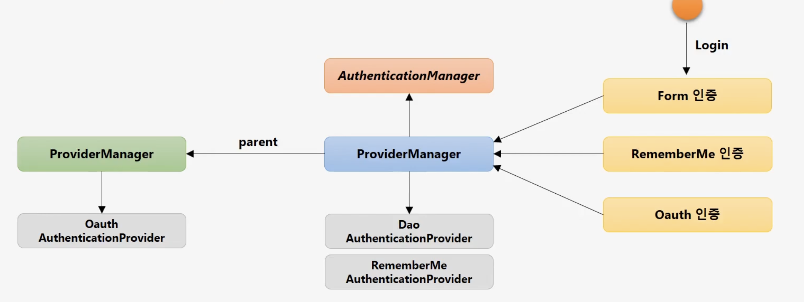๊ทธ๋ฐ ๋ค AuthenticationManager ์ธ์ฆ ์ฒ๋ฆฌ๋ฅผ ์์ํ๊ฒ ๋๊ณ , AuthenticationManager๋ ๋ค์ AuthenticationProvider์๊ฒ ์ธ์ฆ ์ฒ๋ฆฌ ์์