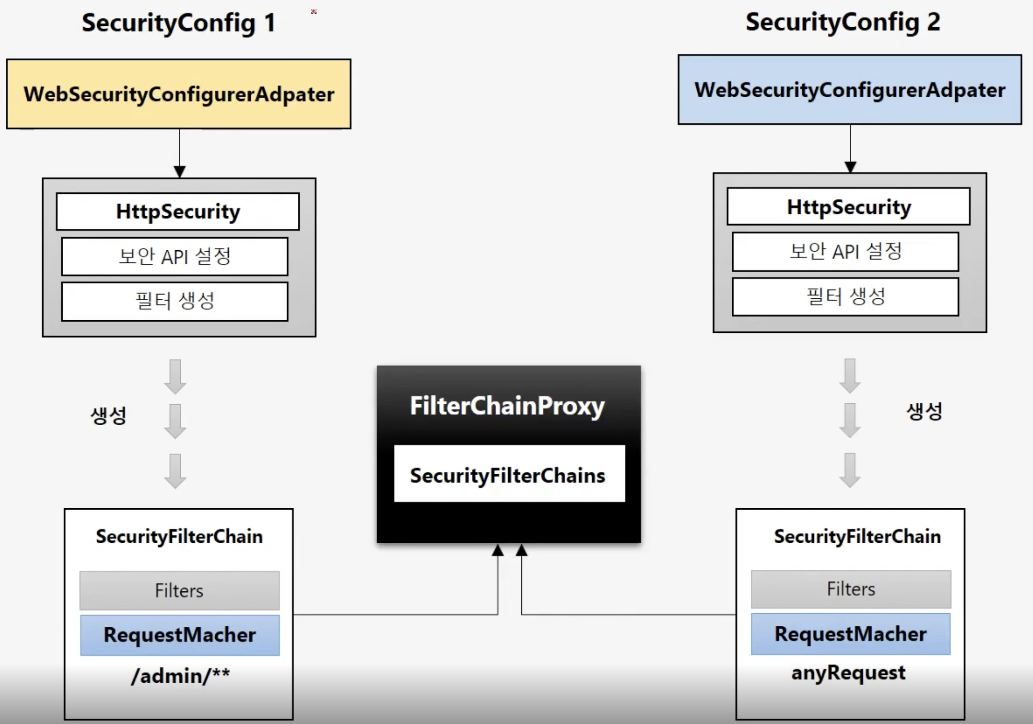 ์์ ๊ทธ๋ฆผ์์๋ /admin URI์ ๋ํ RequestMacher๊ฐ SecurityConfig 1์ ์์ด์.