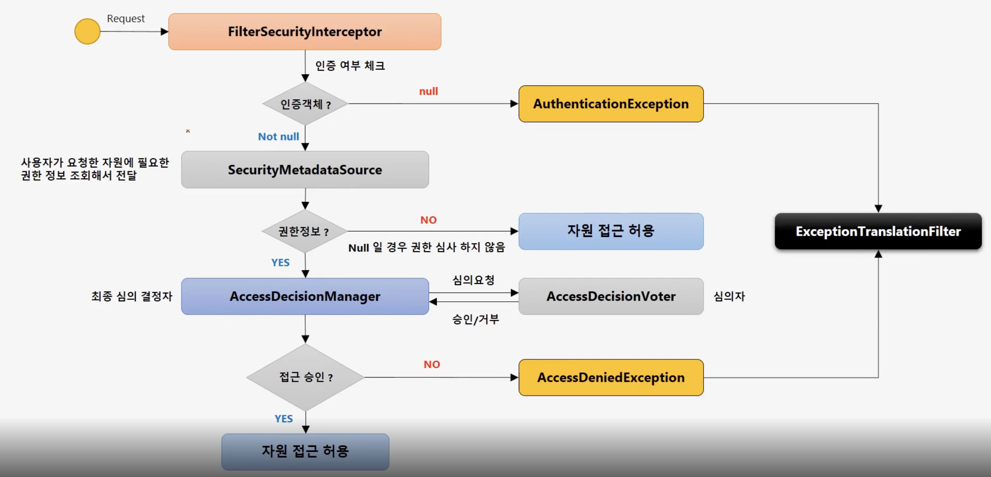 ExceptionTranslationFilter์ FilterSecurityInterceptor๊ฐ ์ธ์ฆ ์ดํ ์์ ์์ฒญ์ด ๋ค์ด์์ ๋, ๊ฐ์ฅ ๋ง์ ์ญํ ์ ํ๋ ์น๊ตฌ๋ค์ด์์.