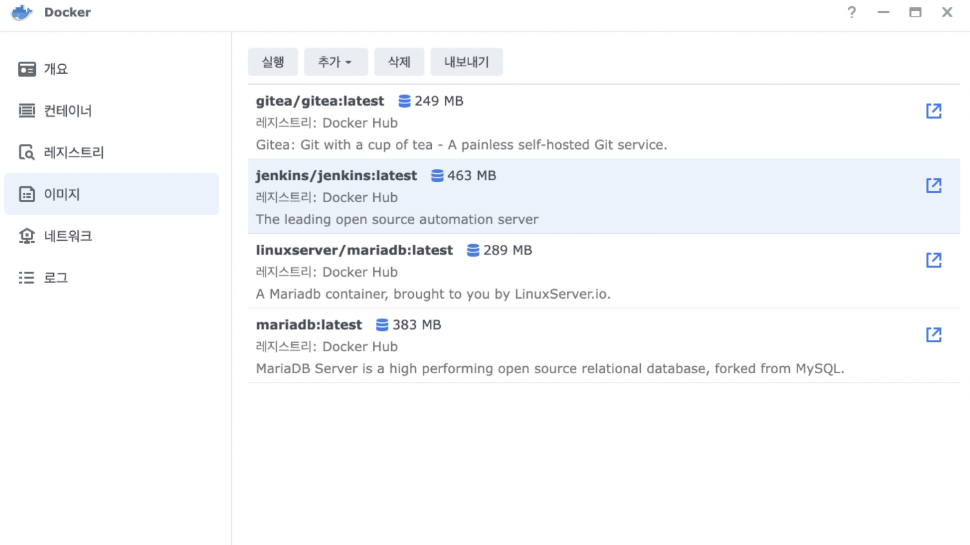 ์ต์ด Synology Docker์ ๋ ์ง์คํธ๋ฆฌ์์ ์์ ๊ฐ์ด jenkis Image๋ฅผ ๋๋ธ ํด๋ฆญํ์ฌ ๋ด๋ ค๋ฐ๊ธฐ ํ์์ด์.