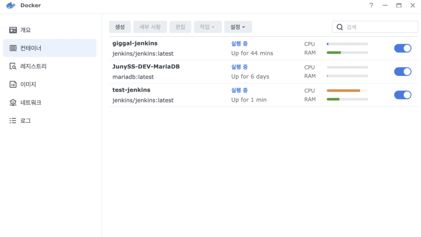 Synology NAS Docker์ ์ปจํ ์ด๋ Tab์ ๋ณด๋ฉด ํ์ฌ ๊ตฌ๋์ค์ธ Container๋ฅผ ๋ณผ ์ ์์ต๋๋ค.
