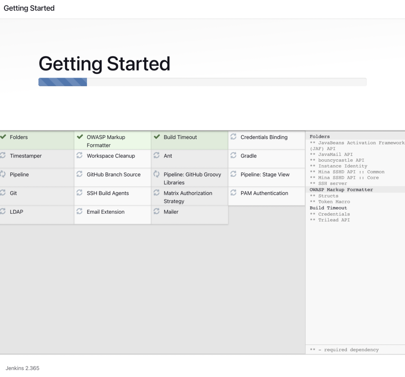 ‘Install suggested plugins’๋ฅผ ๋๋ฌ Jenkins ๊ตฌ๋ ๊ฐ ํ์ํ Plugin์ ๋ชจ๋ ์ค์นํด ์ฃผ๊ฒ ์ต๋๋ค.