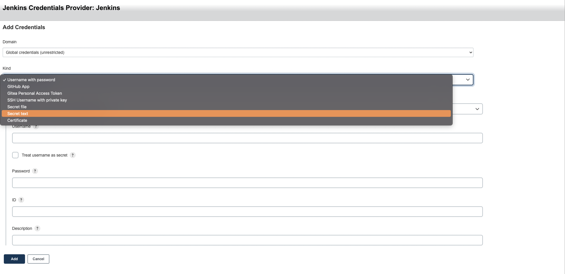 Domain์ Global credentials (unrestricted)๋ฅผ ์ ํํ๊ณ , kind๋ฅผ ๋๋ฌ Secret text๋ฅผ ์ ํํด ์ฃผ์ธ์.