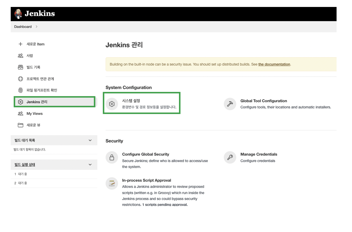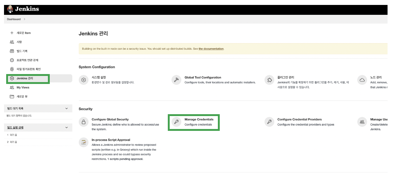 ์ต์ด Jenkins ๊ด๋ฆฌ์์ ์์คํ ์ค์ ์ผ๋ก ๋ค์ด๊ฐ ์ฃผ์ธ์.