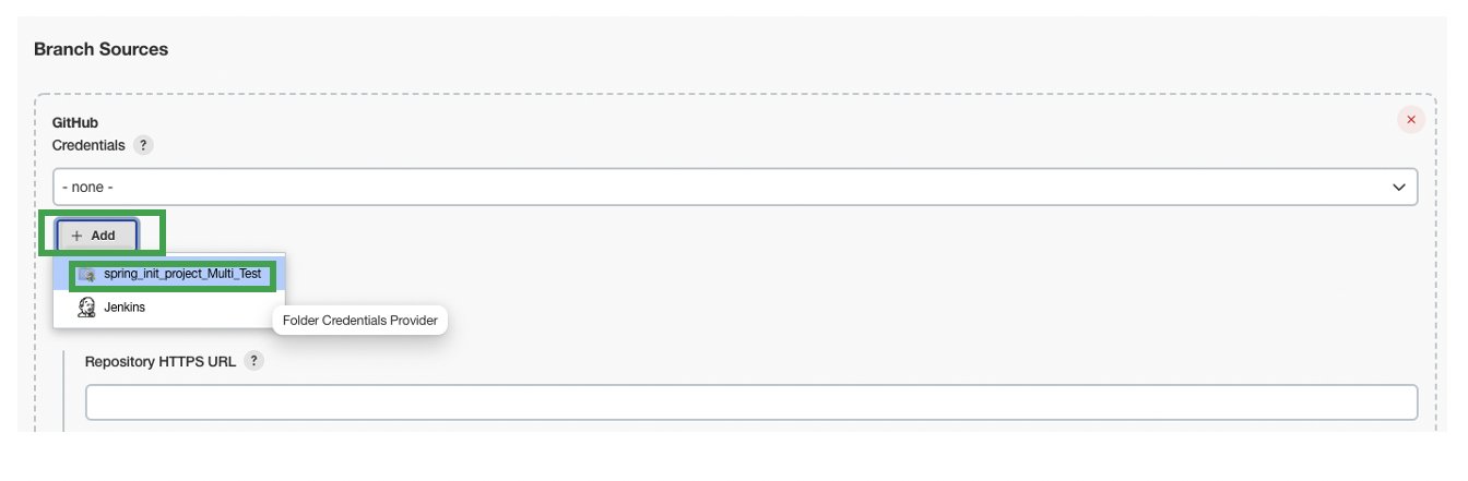 ์์์ ๋ง๋ ๊ณ์ ์ Credentials์์ ์ ํํด ์ฃผ๊ณ , Repository HTTPS URL์ ์ฐ๋ ์ํฌ Github Repository Https ์ฃผ์๋ฅผ ๋ฃ์ด์ค๋๋ค.