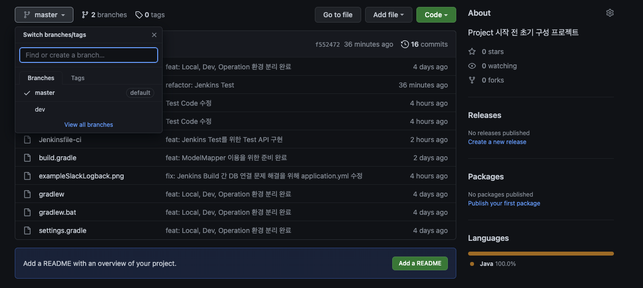 ์์ ๊ฐ์ด Branch๋ ์๋์ผ๋ก ๋ง๋ค์ด์ง๊ณ , Push๋ฅผ ํ๋ฉด ์๋์ผ๋ก ์์์ Build๋ฅผ ์์ํฉ๋๋ค.