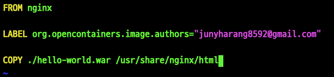 ๋ํ ์ด ์ ์ ๋ง๋ค์ด ๋์๋ Dockerfile์ ์ด์ฉํ ๊ฒ์ธ๋ฐ, ์ฌ๊ธฐ์์ ์ฃผ๋ํ๋์ tomcat์ด ์๋ Nginx๋ฅผ ์ด์ฉํ๋๋ก ์์ ์ ํด ์ฃผ์์ด์.