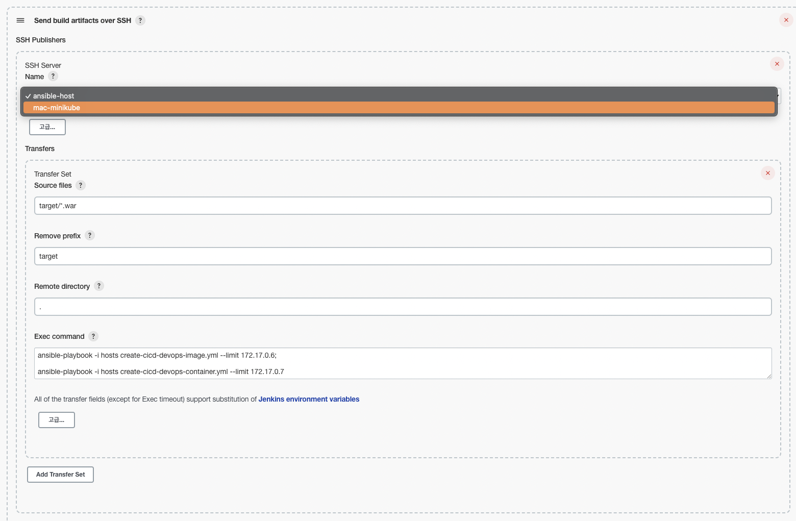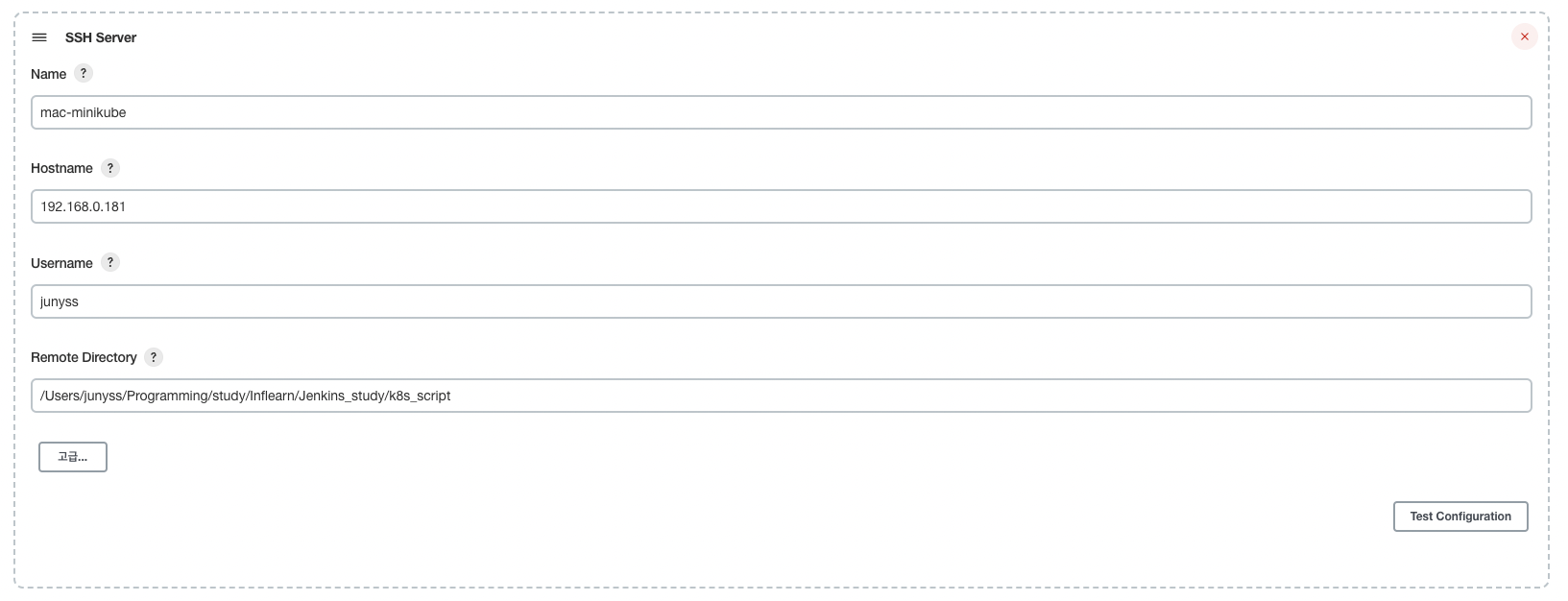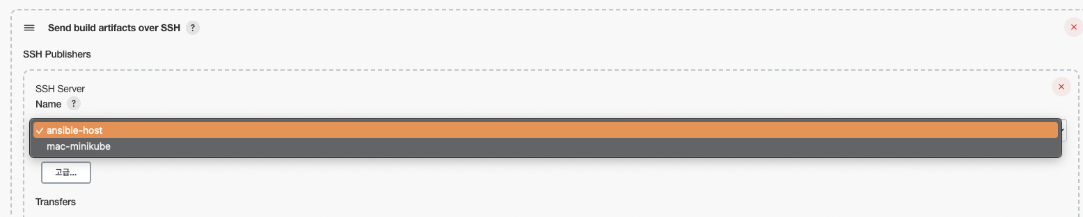 ๋น๋ ํ ์กฐ์น์์ SSH Publishers์ SSH Server๋ฅผ ์์์ ์ค์ ํ๋ mac-minikube๋ก ์ ํ์ ํด ์ฃผ์์ด์.