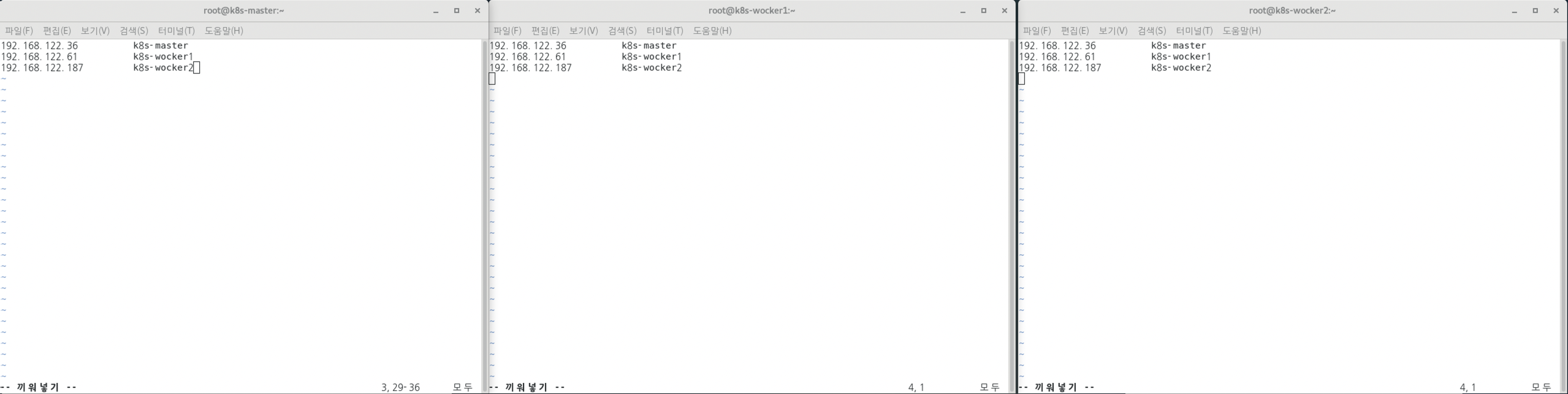 ์ฃผ๋ํ๋์ ์ผ๋จ Master์ ๋ชจ๋ Node์ hosts File์ ์์ ๊ฐ์ด ์์ ํด ์ฃผ์์ด์.