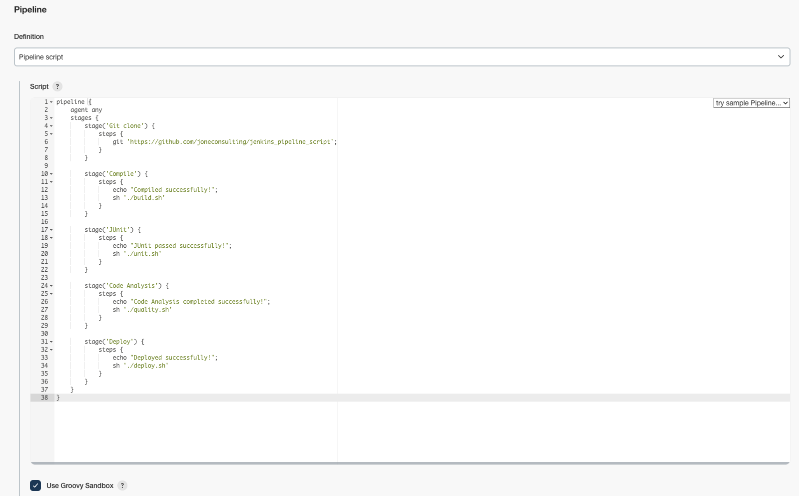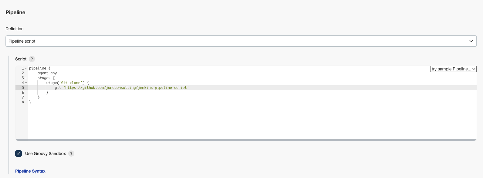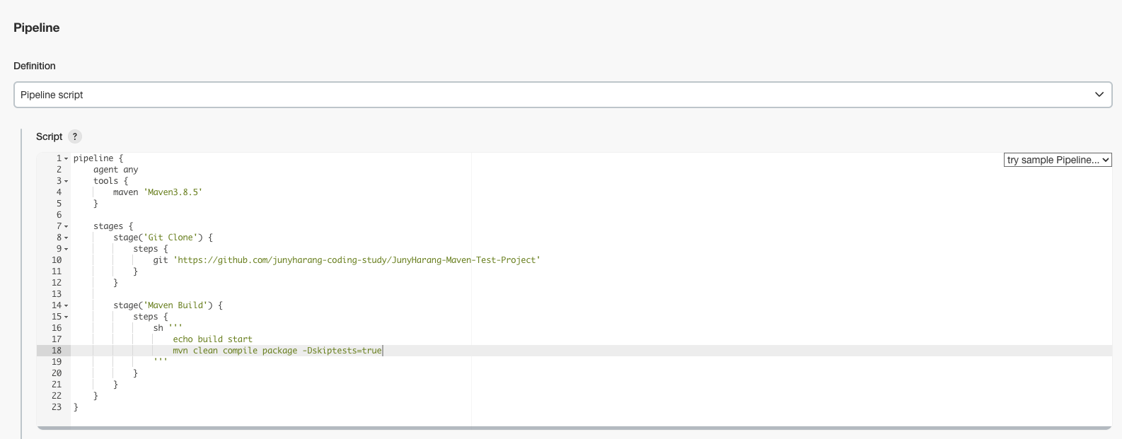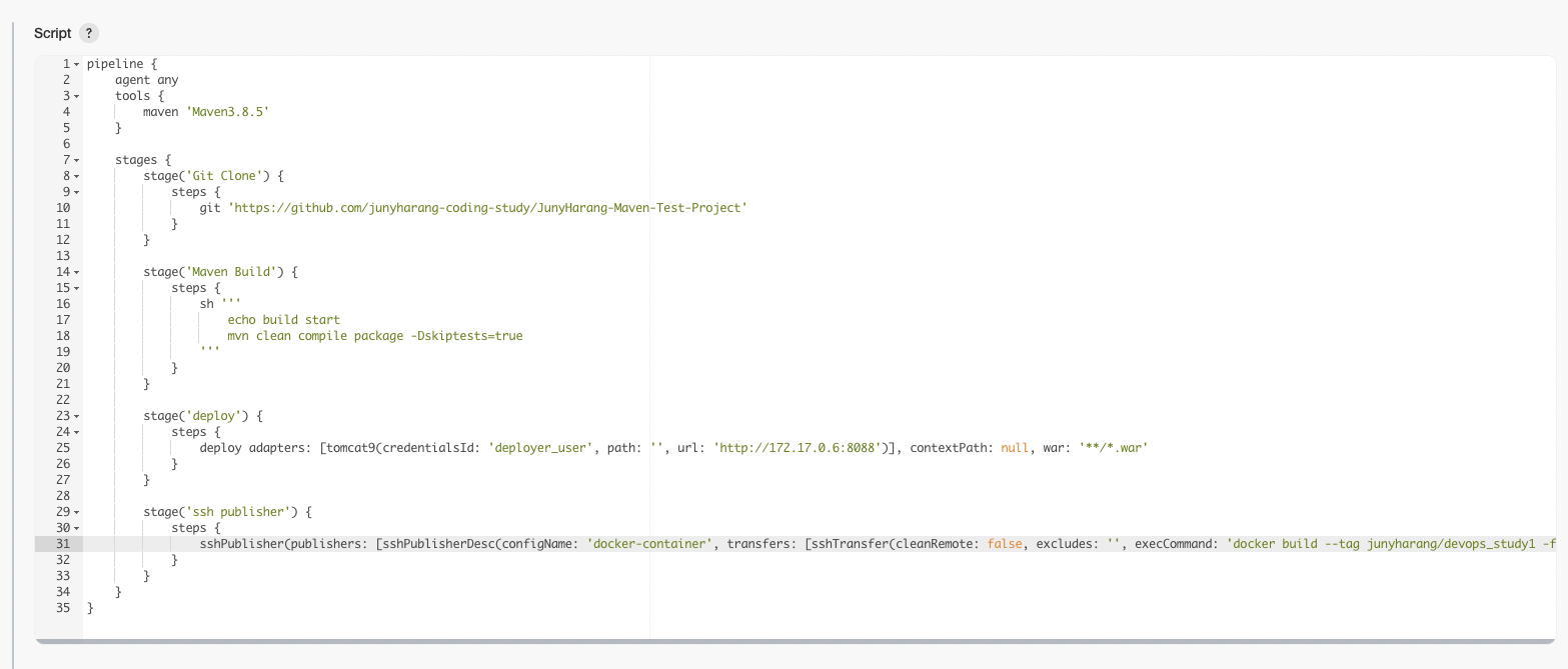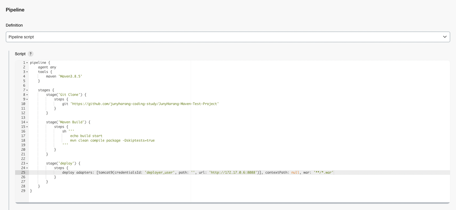 ์์์ ๋ง๋ค์๋ Pipeline Projce ๊ตฌ์ฑ์์ 29๋ฒ์งธ ์ค๊ณผ ๊ฐ์ด Script๋ฌธ์ ์ถ๊ฐํด ์ฃผ์์ด์.