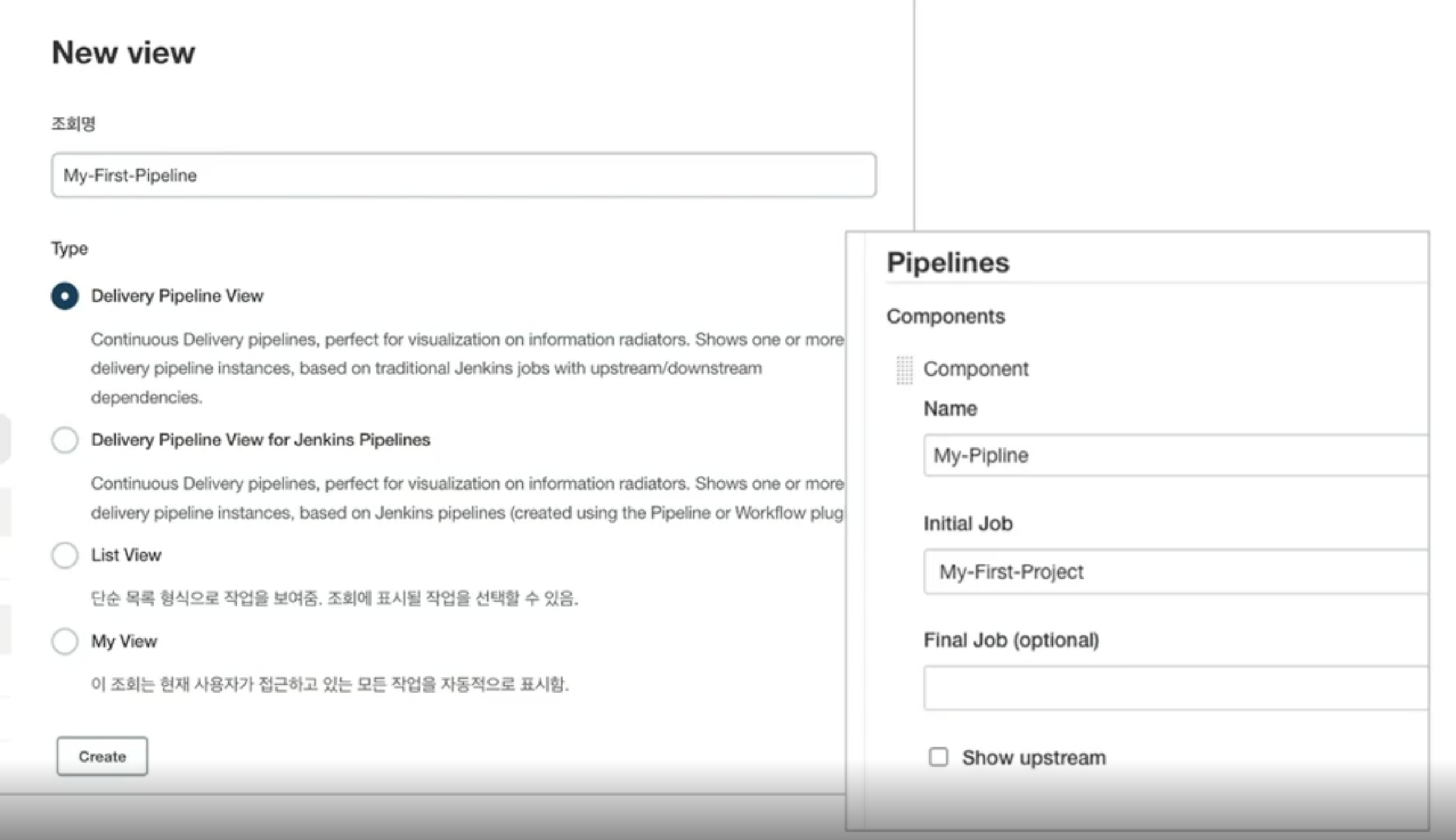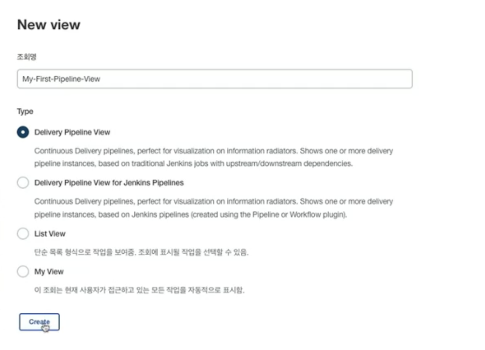 ์ต์ด ์์ ๊ฐ์ด '์๋ก์ด ๋ทฐ'์์ ์ด๋ฆ์ ์ง์ ํด ์ฃผ๊ณ , Delivery Pipeline View๋ฅผ ์ ํํด ์ฃผ์์ด์.