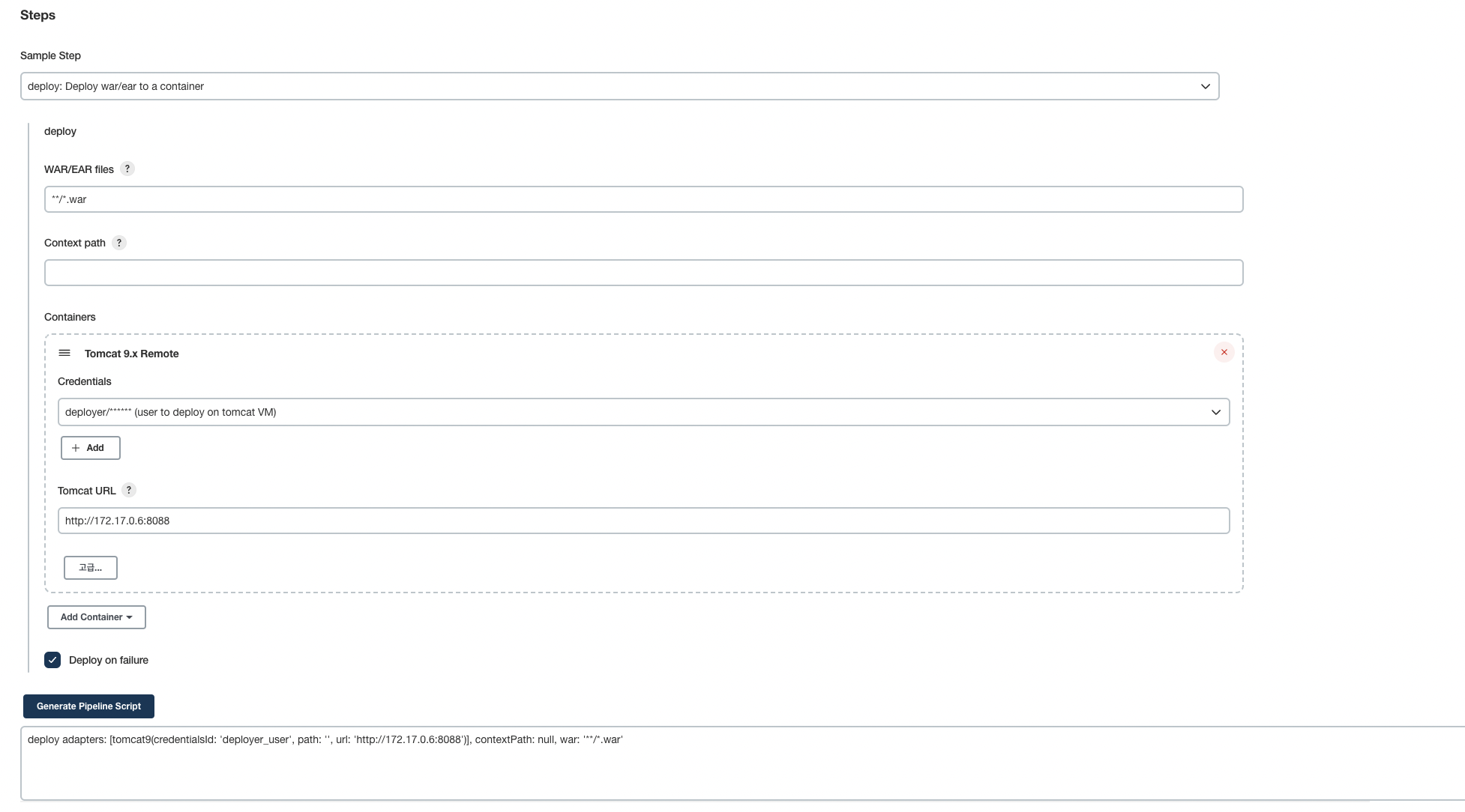 ์์์ ๋ง๋ค์๋ Pipeline Projce ๊ตฌ์ฑ์์ 23๋ฒ์งธ ์ค๊ณผ ๊ฐ์ด Deploy ๊ด๋ จ Script ๋ฌธ์ ์ถ๊ฐํด ์ฃผ์์ด์.