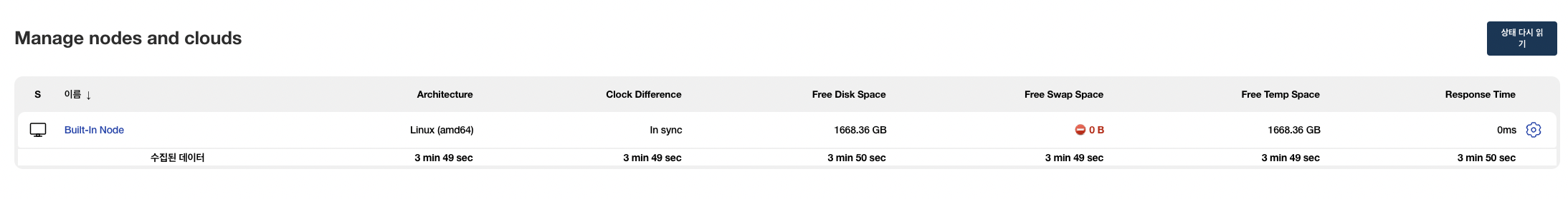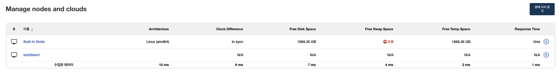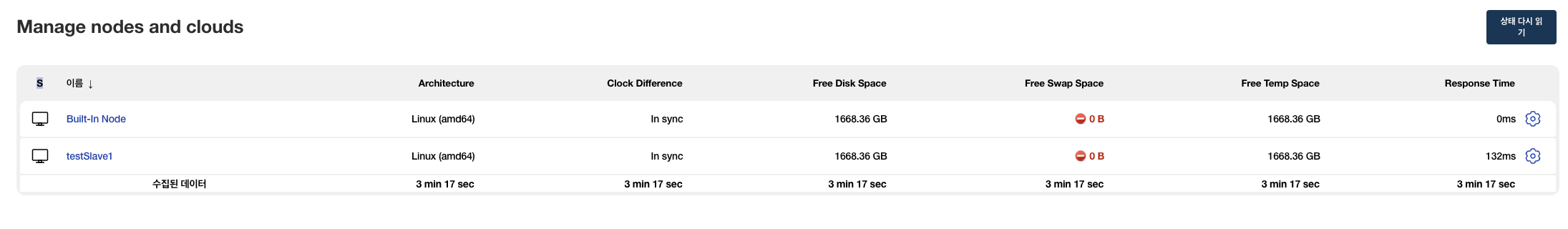 ํ์ฌ ๋ฑ๋ก ๋์ด ์๋ Node๋ Jenkins Master๊ฐ ๋ ์๊ธฐ ์์ ์ด์์.