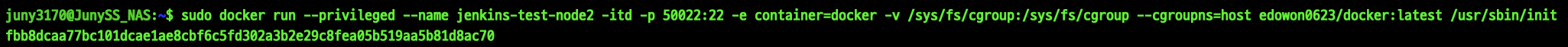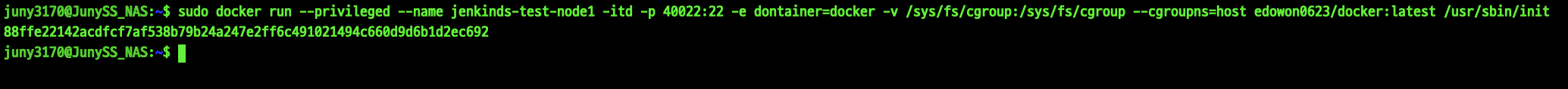 sudo docker run --privileged --name {Container Name} -itd -p {외부 SSH Port 번호}:{내부 SSH Port 번호} -e container=docker -v /sys/fs/cgroup:/sys/fs/cgroup --cgroupns=host edowon0623/docker:latest /usr/sbin/init