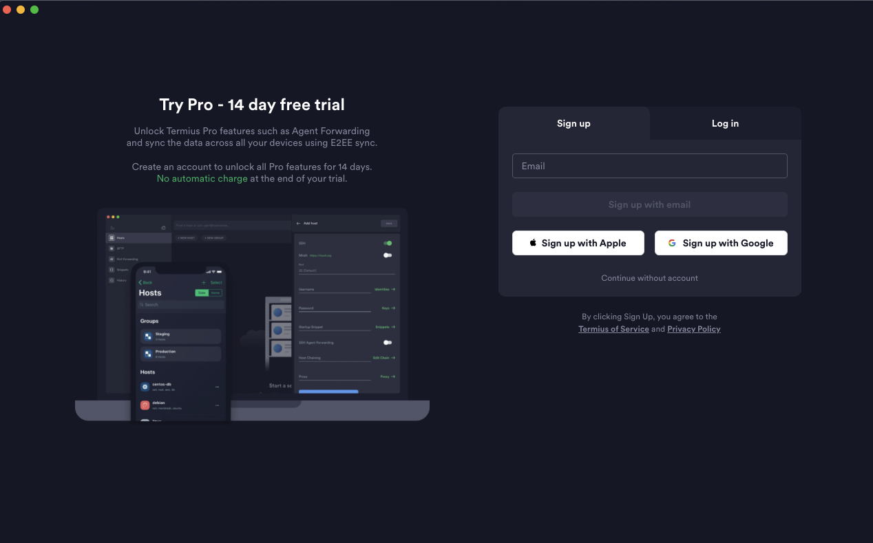 - Split view. You can open up to 4 terminals inside a single tab. - Enterprise SSO. Termius supports more than 30 identity providers.