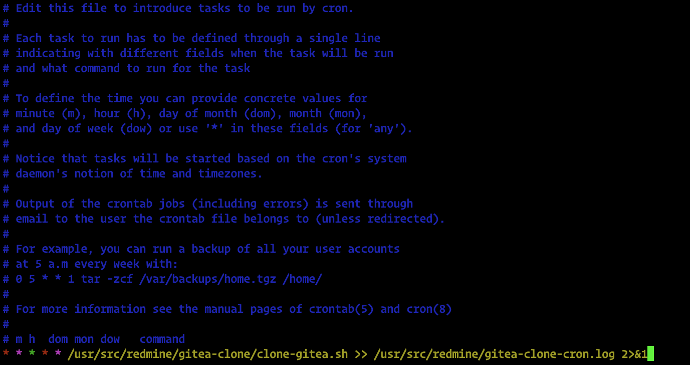 ๋ น์ด๋ฅผ ๋ณด๋ฉด ๋งค์ผ ๋งค ๋ถ๋ง๋ค /usr/src/redmine/gitea-clone/clone-gitea.sh์ ์คํํ๊ณ , ๊ฑฐ๊ธฐ์ ๋ฐ์๋๋ ๋ด์ฉ๋ค์ /usr/src/redmine/gitea-clone-cron.log์ ๋จ๊ธฐ๋ผ๋ ๋ช