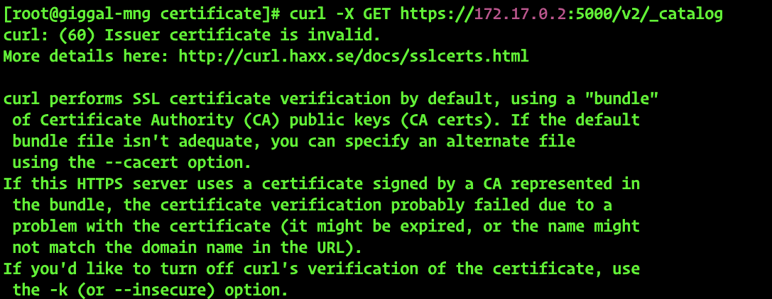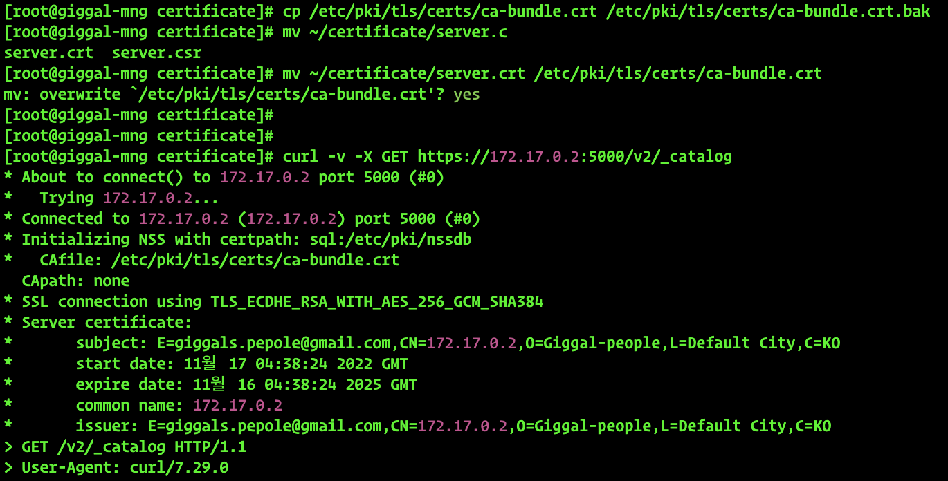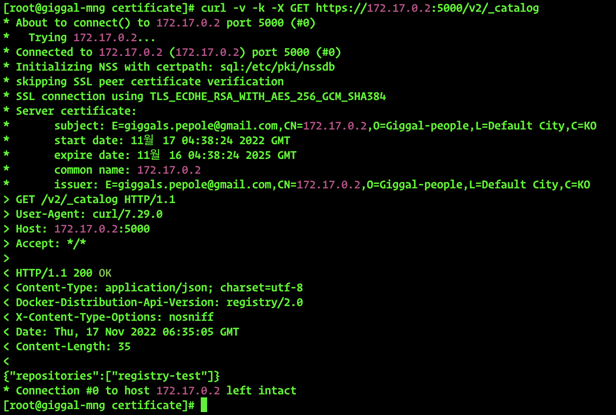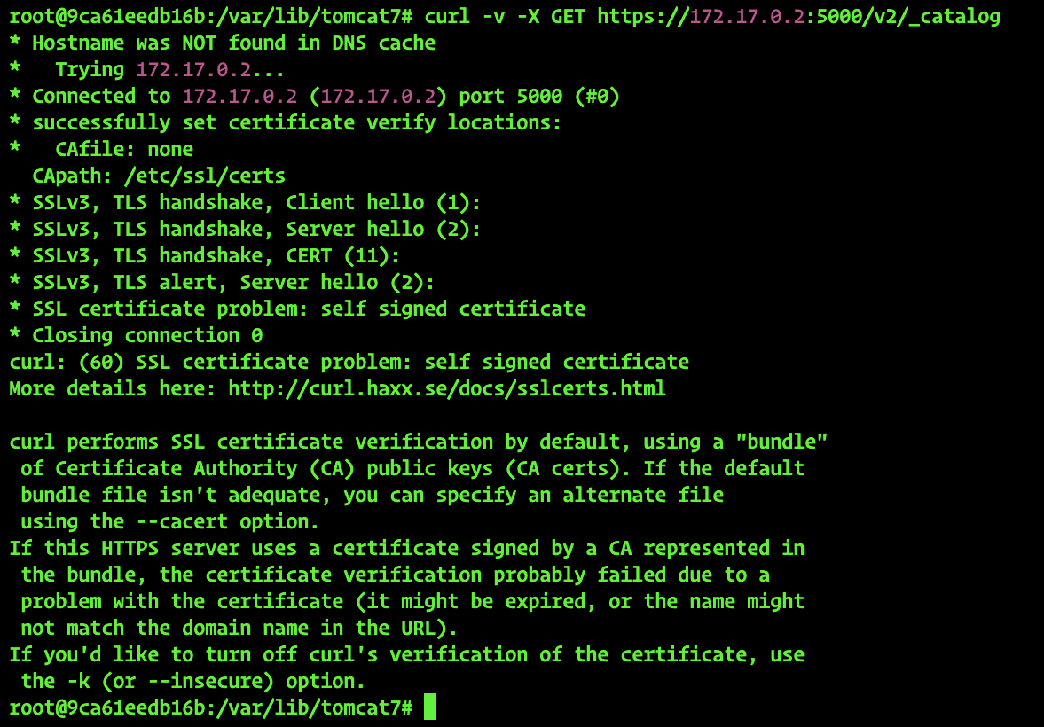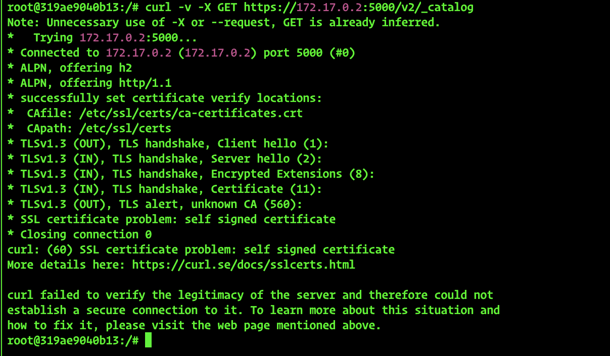 root@319ae9040b13:/etc/ssl/certs# curl -v -X GET https://172.17.0.2:5000/v2/_catalogNote: Unnecessary use of -X or --request, GET is already inferred.